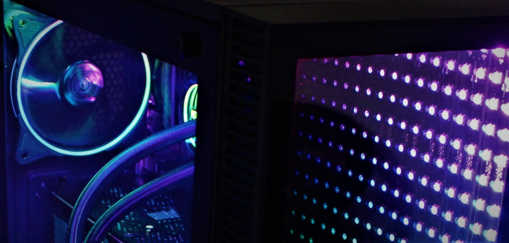 Ein paar Bilder vom beleuchteten Gehäuse dürfen natürlich nicht fehlen und sind hier zu Anschauung hinzugefügt. Es gibt sehr viele Einstellungen, die nach Herzenslust vorgenommen werden können. Ob über die vorprogrammierten RGB-Modi mit Schalter am Gehäuse oder über die Software der Mainboard-Hersteller – hier kann man sich austoben. Kirmes-Disco-Party oder dezent abgedunkelt oder auch ganz aus alles ist möglich und der Fantasie sind kaum Grenzen gesetzt.