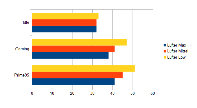 Die Lautstärke hält sich auf den ersten beiden Stufen der Lüftersteuerung in Grenzen, erst auf der dritten Stufe drehen die Lüfter deutlich hörbar auf. Auf der ersten Stufe sind sie wiederum knapp über unhörbar – also definitiv leise genug und keineswegs störend.