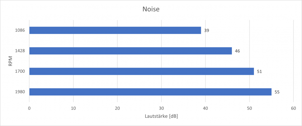 Unser Testsystem ist geschlossen und die Messung erfolgt bei einer Distanz von 50 cm. Im unteren Bereich bei ca. 1086 RPM ist das System leise, man vernimmt ein leichtes Geräusch der Lüfter. Ab ca. 80 % (ca. 1500 RPM) vernimmt man das System schon als lauter aber nicht störend. Dieser Test basiert auf der automatischen Kalibrierung der Lüfter in der Software des Mainboards dem MSI-Center. Abgesehen davon, ist es möglich die Lüfter individuell einzustellen, sodass das System kaum wahrgenommen wird und extrem leise und doch effizient arbeiten kann. Wir sind überzeugt und begeistert.
