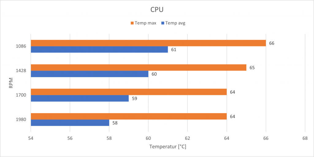 Bei einer RPM von 1086 konnten wir eine Temperatur von 61 °C verzeichnen. Dies entspricht einer manuellen Steuerung von 25 % der CPU-Lüfter. Bei einer Einstellung von 50 % ergab die Temperatur einen Wert von 60 °C. Bei den Stufen 75 % und 100 % fiel die Temperatur um jeweils 1 °C ab. Man beachte eine statische Drehzahl der System-Lüfter von ca. 760 RPM.