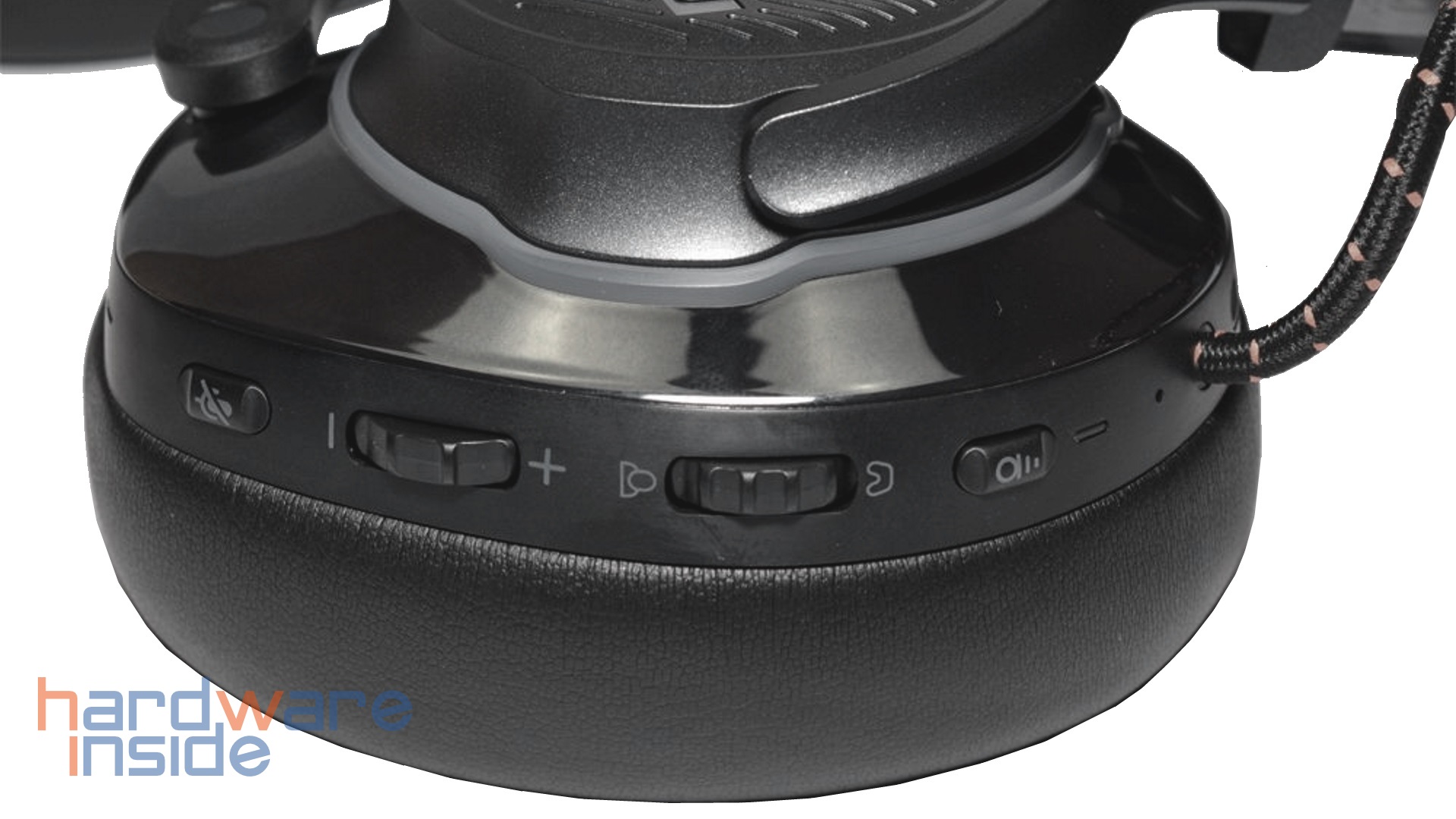 Auf der linken Seite ist der überwiegende Teil der Bedienungselemente untergebracht. Auf dem Bild sehen wir ganz links die Taste zum Stummschalten des Mikrofons. Daneben folgt ein Rad zum Einstellen der Lautstärke. Darauf folgt ein weiterer Drehschalter, mit der die Chat-Lautstärke im Verhältnis zur Game-Lautstärke abgeglichen werden kann. Die letzte Taste dient dem ein- bzw. ausschalten der aktiven Geräuschunterdrückung und TalkThru. Die Status LED daneben zeigt an, ob diese Funktion aktiviert ist. Im unteren Bereich sind der USB-Typ-C Anschluss und der 3,5 mm Klinke Anschluss untergebracht.