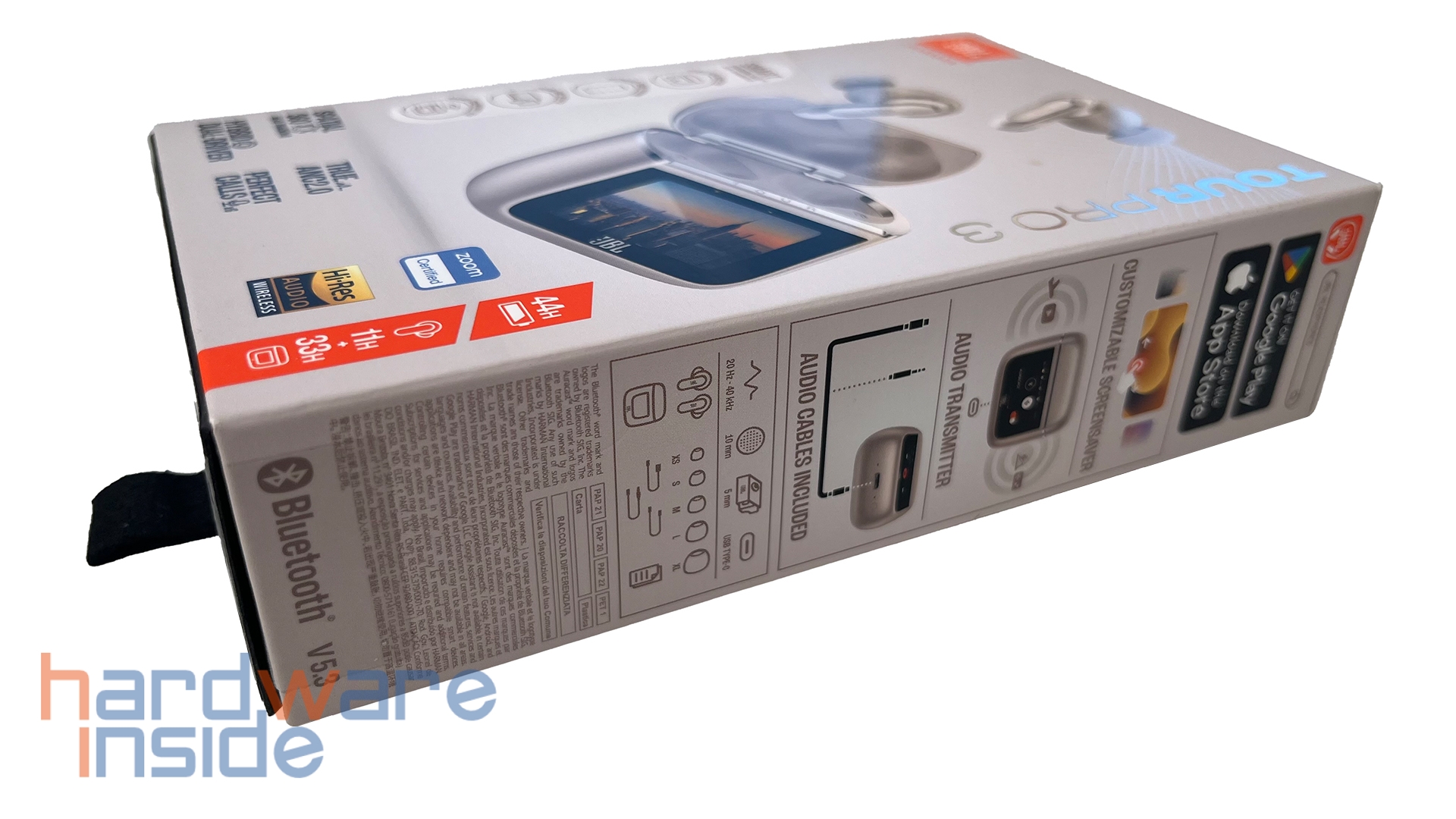 Die Verpackung der JBL TOUR PRO 3 Kopfhörer ist nicht gerade minimalistisch gestaltet. JBL versucht hier ein Lifestyle-Produkt zu vermarkten und die Masse an Features, die das Produkt mitbringt, sauber und geordnet auf der Verpackung zu illustrieren. Dazu nutzt JBL alle Flächen aus. Auf der Front sehen wir links einen Bereich, der das Smart-Charging Case thematisiert. Unten finden wir die interessantesten Funktionen und Kompatibilitäten. Rechts die wichtigsten Daten zur Akkulaufzeit und -kapazität.