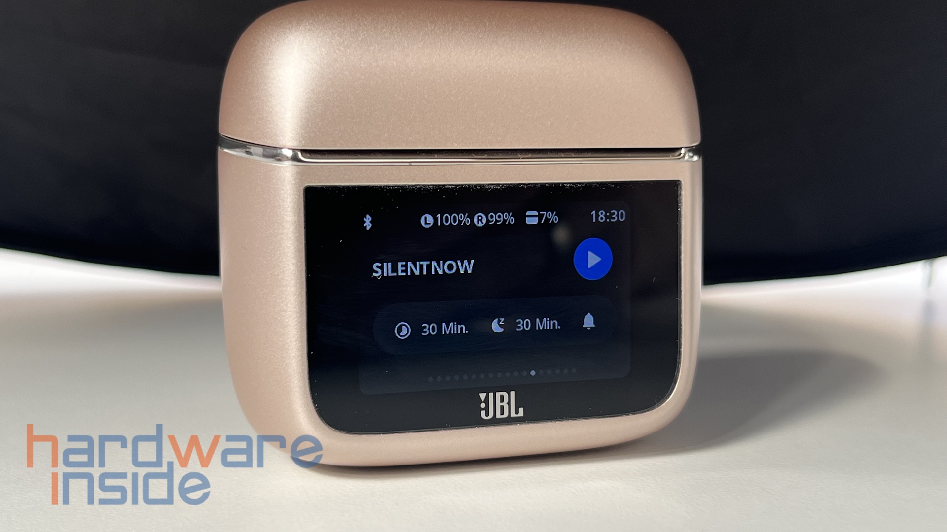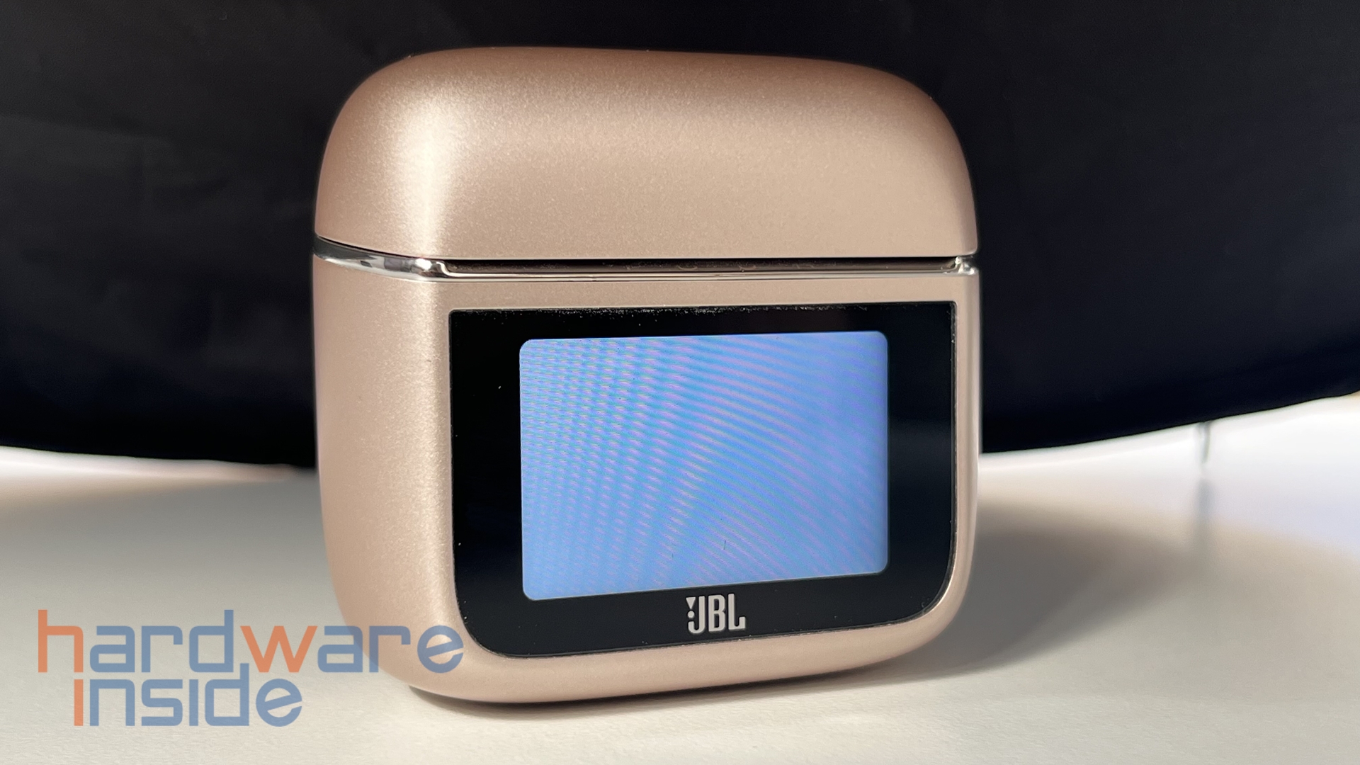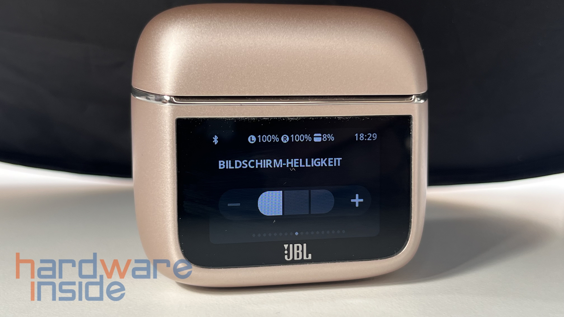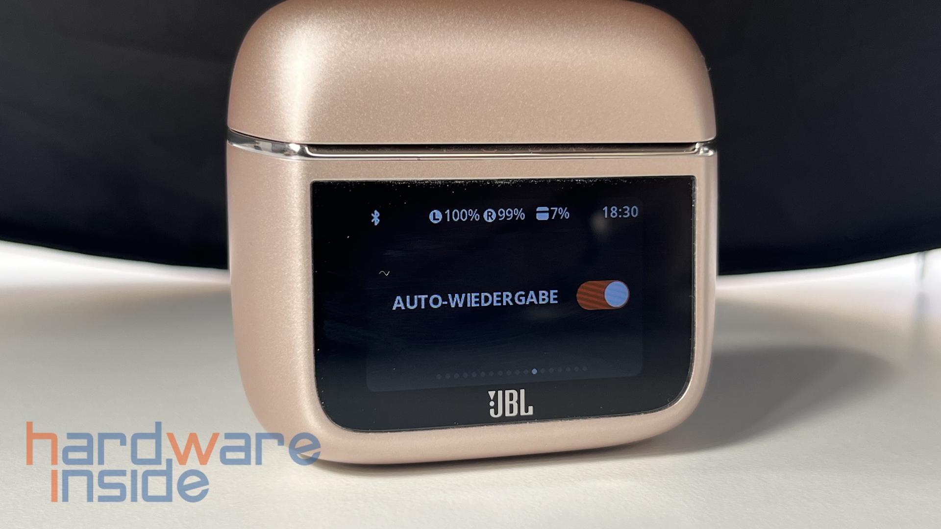 Ein echtes Highlight ist jedoch das Ladecase. Dieses steht den Ohrhörern in Sachen Verarbeitung in nichts nach und greift die Designsprache konsequent auf. Kompakt gebaut, stabil verarbeitet und ebenfalls in der schicken Latte-Farbe gehalten, macht es nicht nur optisch etwas her, sondern fühlt sich auch hochwertig an. Das absolute Alleinstellungsmerkmal ist jedoch der integrierte Screen auf der Vorderseite. Dieser ist in dieser Form alles andere als selbstverständlich und hebt die TOUR PRO 3 klar von vielen Konkurrenzprodukten ab.
