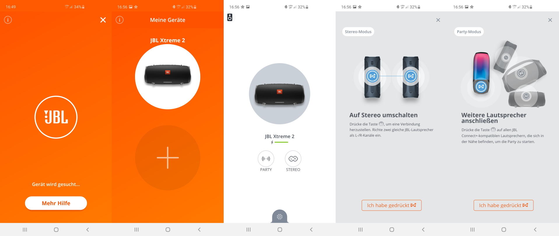 Von JBL gibt es auch eine App, welche aber nicht zwingend notwendig ist, um den JBL XTREME 2 zu nutzen. Vielmehr dient die App dazu die Firmware des Lautsprechers aktuell zu halten sowie um den Stereo-Modus und den Party-Modus starten. Beim Stereo Modus werden zwei Lautsprecher so gekoppelt, dass der eine nur den linken und der andere nur den rechten Audiokanal wiedergibt. Der Party-Modus dagegen kann bis zu 100 Geräte so zusammenschalten, dass diese sich wie ein Lautsprecher verhalten. Dadurch können dann auch große Räume in guter Lautstärke beschallt werden.