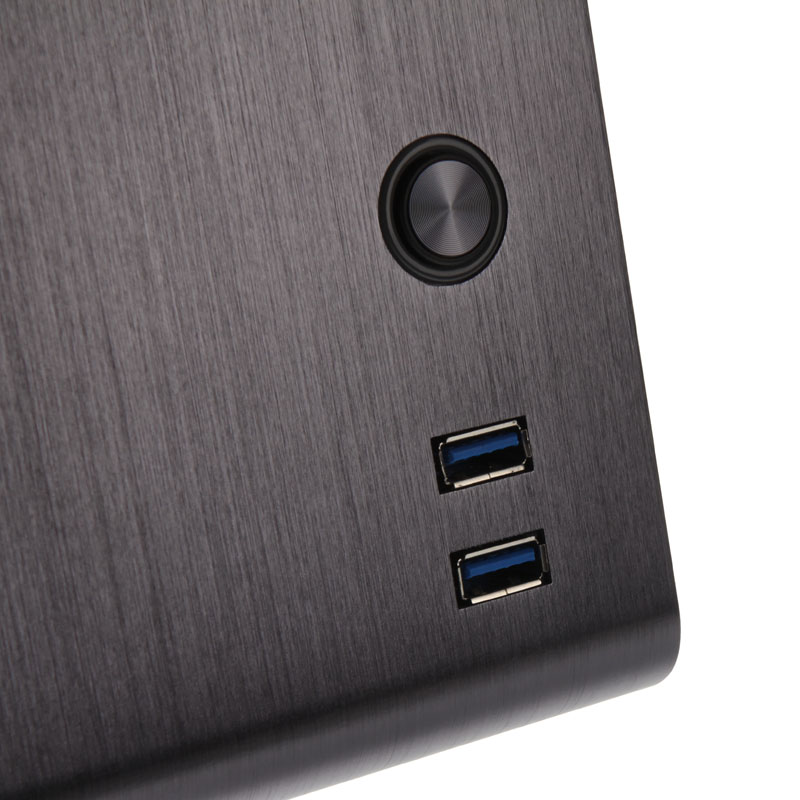 Äußerlich beeindruckt der innovative Winzling durch sein asketisches Design und die makellose Verarbeitung des anodisierten Aluminiums in Titangrau. Das Metall mit 1,5 Millimetern Stärke und dem schicken Hairline-Finish sorgt für einen unverwechselbaren Look. An der schlichten Vorderseite des Rocket befinden sich neben dem Power-Button lediglich zwei USB-3.0-Ports mit internem Mainboard-Anschluss. Insgesamt ist Kolink mit dem Rocket ein Gehäuse der Extraklasse gelungen.