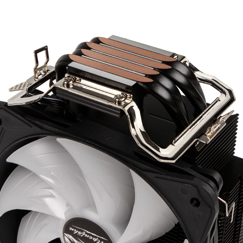 Hervorragende Kühlleistung und minimale Geräuschentwicklung: Der CPU-Kühler Ben Nevis Advanced von Alpenföhn schafft beides und sieht in der Advanced Black RGB Edition mit seiner LED-Beleuchtung dabei auch verdammt gut aus So kommen vier 6 Millimeter-Heatpipes zum Einsatz, die direkt auf dem Heatspreader der CPU aufliegen. Dadurch ist eine zuverlässige und schnelle Übertragung von Abwärme auch mit konventioneller Wärmeleitpaste gewährleistet. Der zentral im Kühler platzierte Schock-Killer-Pole sorgt im etwas größeren Kühlkörper für eine Stabilisierung der Lamellen und beugt somit Schäden durch direkte Krafteinwirkungen und Erschütterungen vor.