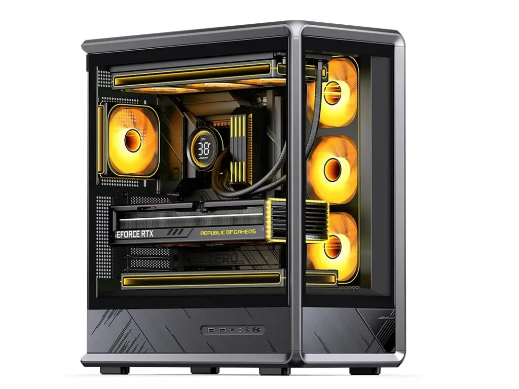 Mit dem D401 Black stellt JONSBO ein außergewöhnliches Mid-Tower-Gehäuse vor, das sich durch einen externen Exoskelett-Rahmen in dunklem Metallic-Grau von klassischen Designs abhebt. Zwei große Temperglas-Panels an Front und Seite machen das Gehäuse ideal für Showcase-Builds und sorgen zugleich für hohe Stabilität und optimierten Luftstrom.