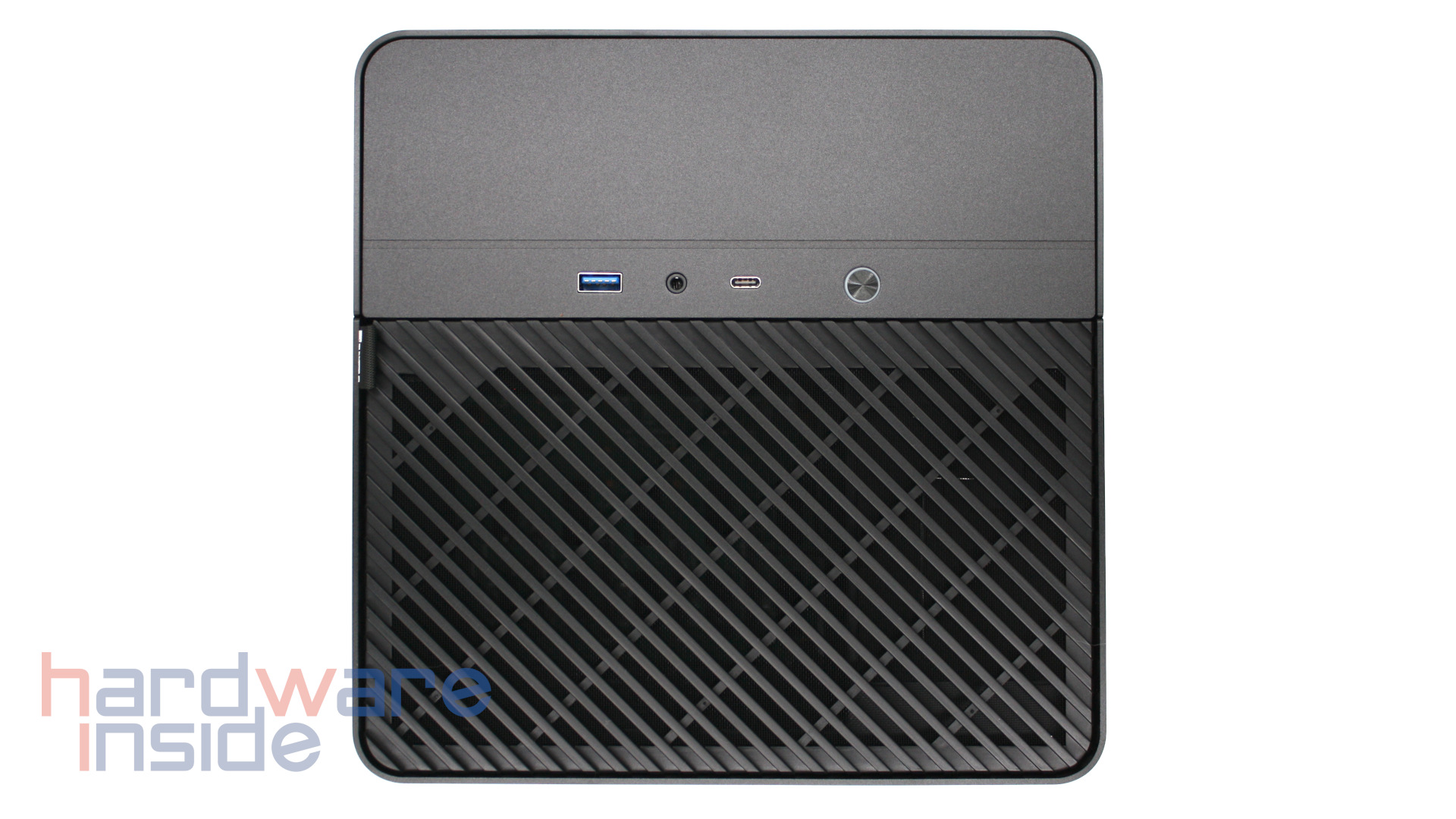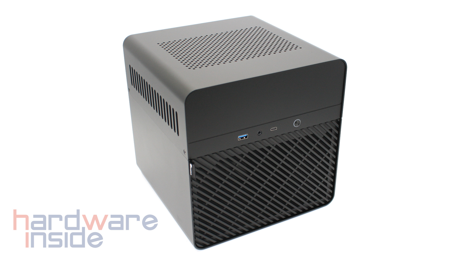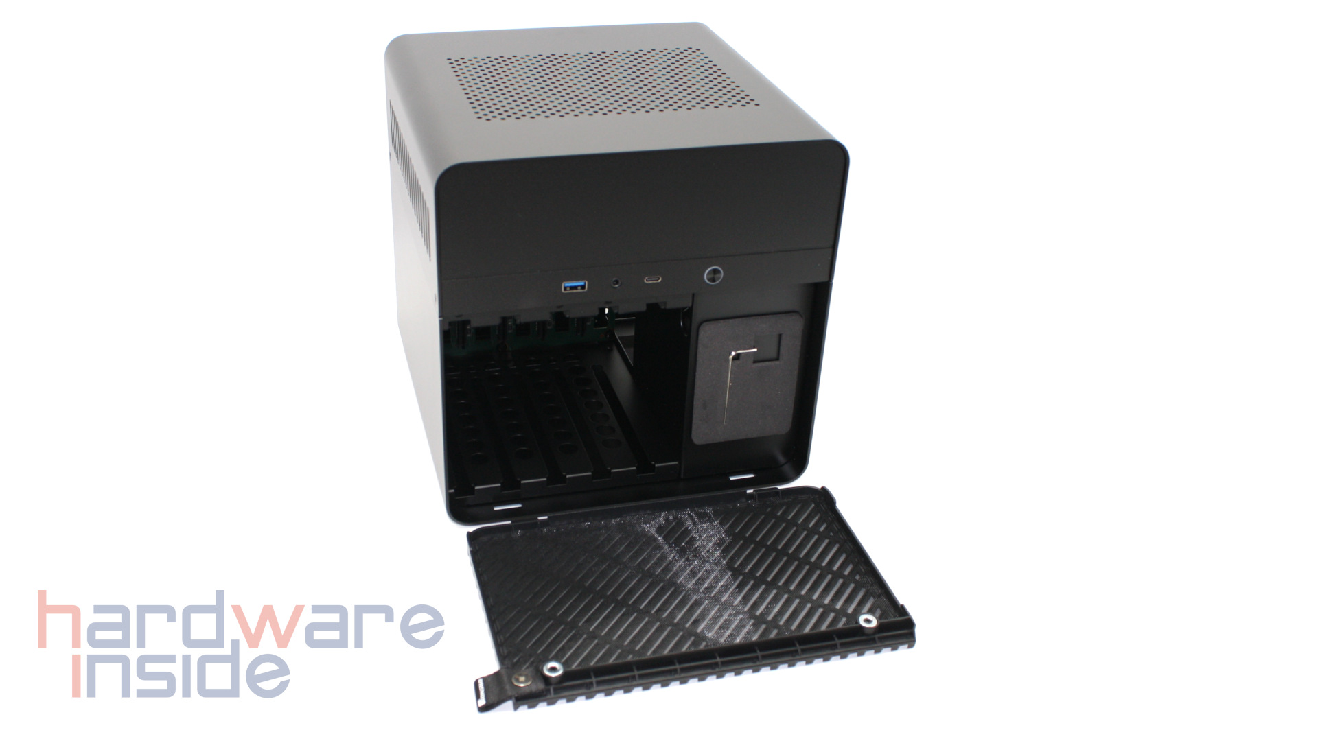 Die Außenhülle des Jonsbo N2 black besteht aus matt lackiertem Aluminium. Auf der Vorderseite befindet sich neben dem runden Powerknopf ein USB Typ A, ein USB Typ C und ein kombinierter Kopfhöreranschluss. Direkt darunter ist eine magnetisch gehaltene Abdeckung untergebracht, unter der sich die fünf Festplatteneinschübe befinden. Dort befindet sich auch ein kleiner Innensechskant, der zum Öffnen der oberen Abdeckung benötigt wird. Die Abdeckung des Festplattenkäfigs besitzt sowohl Lüftungsschlitze als auch ein feinporiges Lüftergitter. Die obere Abdeckung ist ebenfalls an allen Seiten mit Lüftungsschlitzen sowie seitlich mit einem groben Lüftungsgitter versehen. So kann das eingebaute Mainboard von vielen Seiten mit Luft versorgt werden.