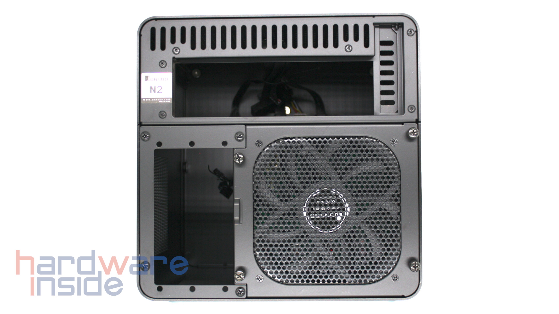 Auf der Rückseite befinden sich Steckplätze für die IO-Blende des Mainboards und für das SFX-Netzteil, wobei Mini-ITX-Mainboards und SFX-Netzteile mit einer Länge von bis zu 150 mm unterstützt werden. Direkt neben dem Netzteilschacht ist ein vorinstallierter 120-mm-Lüfter verbaut. Dieser ist in einem eigenen Käfig montiert, damit er nicht von den Kabeln im Gehäuseinneren blockiert wird. Er saugt die Luft an den Festplatten vorbei aus der Vorderseite des Gehäuses und sorgt so für einen kühlenden Luftstrom.