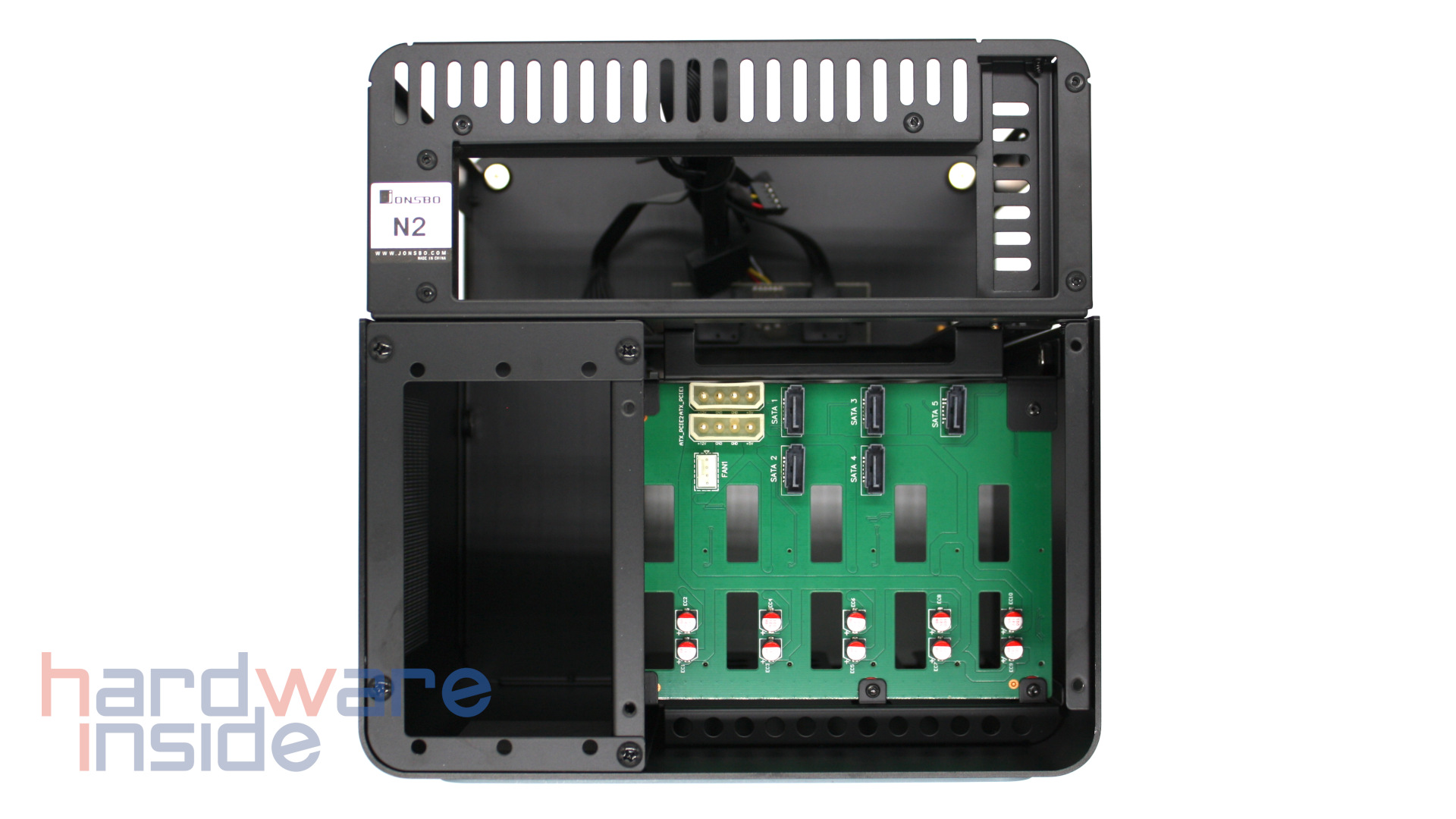 Im Inneren des Jonsbo N2 befinden sich Anschlüsse für fünf SATA-Festplatten. Damit diese auch im Gehäuse eingesetzt werden könne, müssen an ihnen zuvor ein paar Schrauben und ein Griff aus Gummi befestigt werden. Die Festplattenplätze sind sowohl auf dieser als auch auf der Rückseite beschriftet.