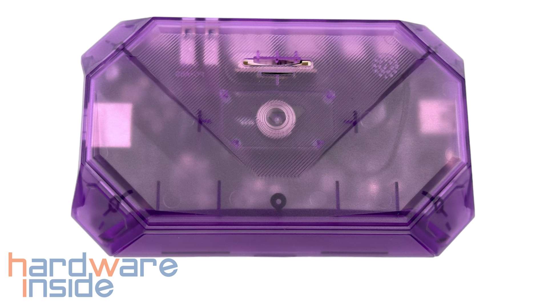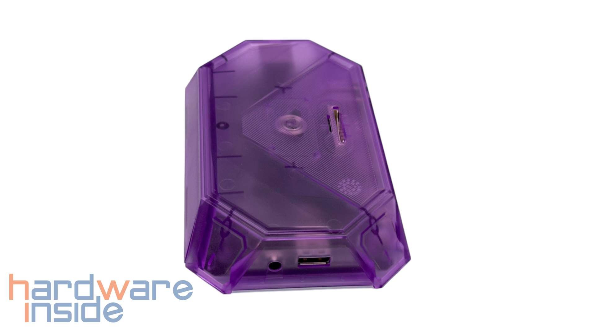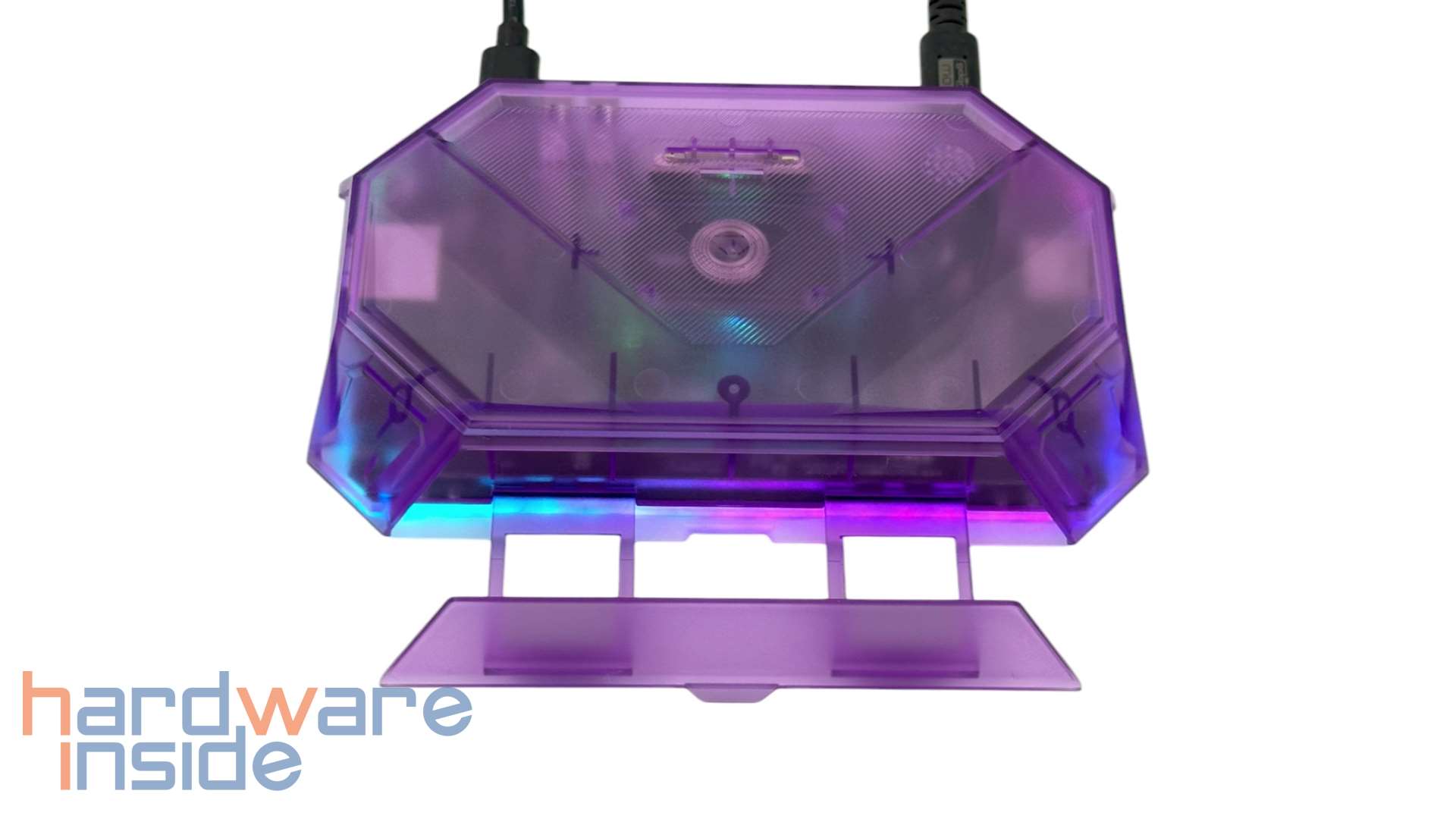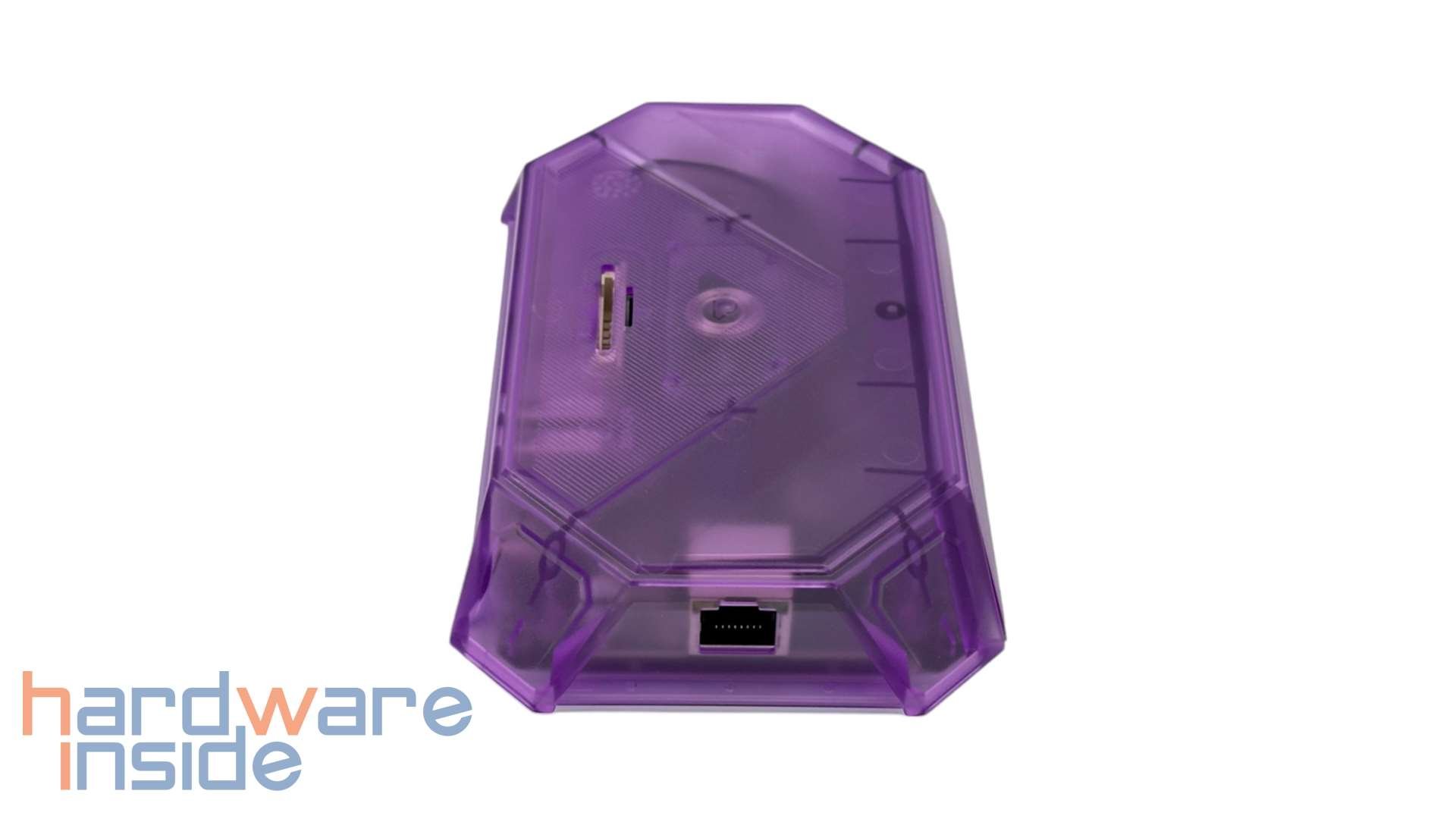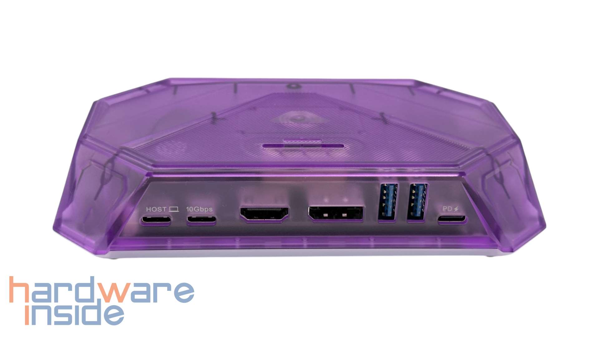 Die JSAUX RGB Docking Station ist in mehreren Varianten erhältlich, welche sich in Farbe und den Anschlüssen unterscheiden. Wir haben hier das Modell HB1201S in der Variante mit einem in Lila getönten, transparenten Gehäuse. Durch das Gehäuse können wir verschwommen ins Innere der Dockingstation hineinsehen. Auf der Oberseite finden wir zwei Schlitze für Speicherkarten. Hier passen SD- und microSD-Speicherkarten. Das ist etwa praktisch, wenn man ein wenig mehr Speicher braucht, oder mal eben die Fotos/Videos von der Kamera ansehen will. Allerdings kann der Kartenleser nur jeweils eine Karte bedienen – zwei gleichzeitig sind nicht möglich. Unterhalb des Kartenlesers ist eine Bedienfläche, mit der sich die RGB-Beleuchtung ein- und ausschalten lässt.