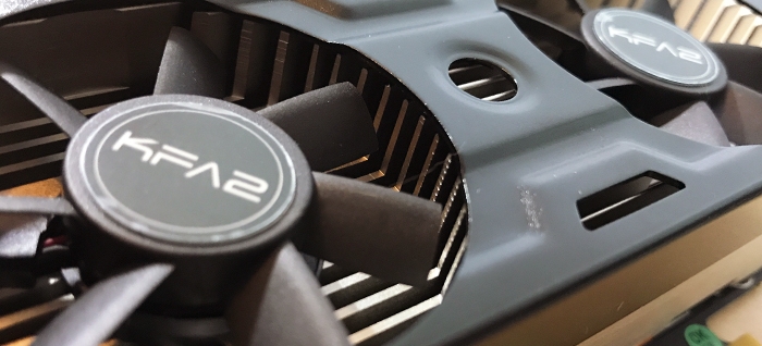 Die Verarbeitung ist tadellos und die Karte ist für ihre geringe Größe relativ schwer. Das liegt hauptsächlich an dem massiven Kühlkörper aus Aluminium, der eine Auflagefläche aus Kupfer besitzt. Die Kühlung wird aktiv durch zwei 50mm-Axiallüfter unterstützt. Nicht zuletzt durch die schwarz lackierte Abdeckung aus Metall entsteht hier der Eindruck, eine hochwertige Komponente in der Hand zu halten.