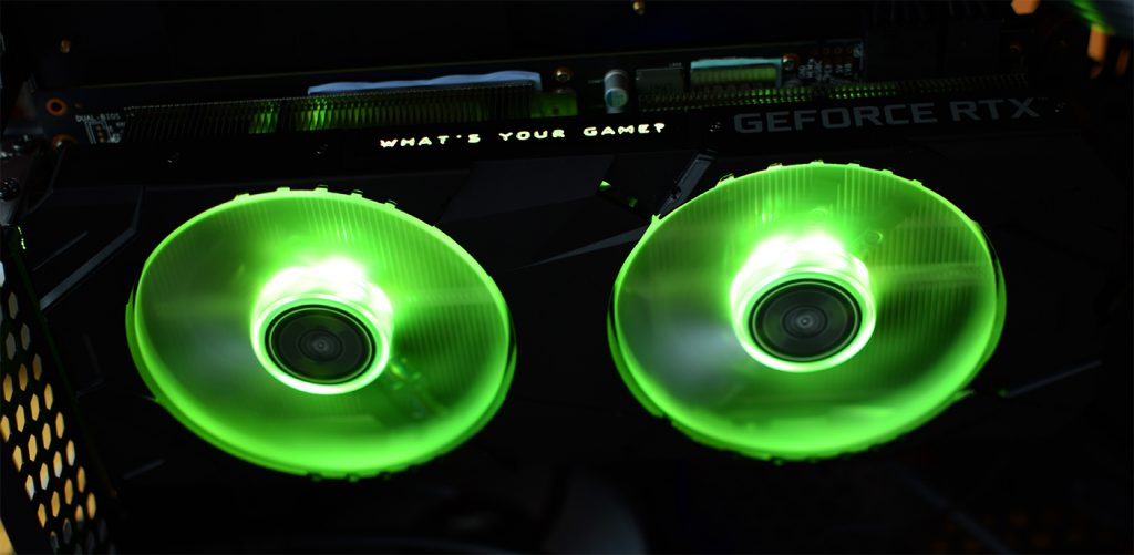 Wo wir gerade bei den Farben sind. Durch das hervorragende Kühlerdesign und die knackigen Farben, kommen die Lüfter sehr gut zur Geltung. Die KFA2 GeForce RTX 2060 SUPER EX 8GB [1-Click OC] kommt mit aktiviertem zirkulierenden RGB-Effekt zu uns. Eine Änderung in die jeweiligen Effekte und Farben ist frei wählbar. Der Schriftzug „What´s your Game?“ wird ebenso in der Farbe der Lüfter beleuchtet.