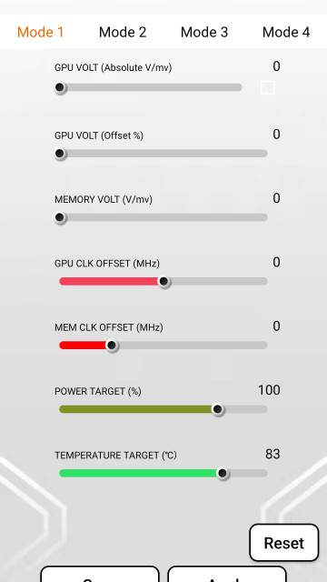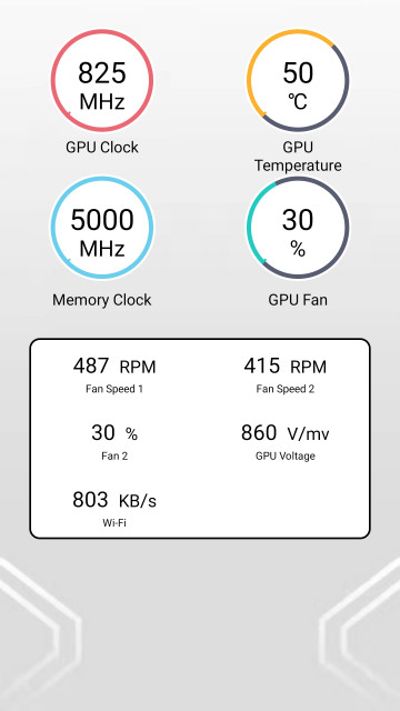 Grundsätzlich bietet die mobile App einen ähnlichen Funktionsumfang wie die PC-Variante. In der Übersicht werden die aktuellen GPU- und Speichertaktfrequenzen, die GPU-Temperatur, die Lüfterdrehzahlen und die aktuelle GPU-Spannung angezeigt. Die Einstellung der Lüfter erlaubt in der mobilen App nur die Einstellung auf konstante Geschwindigkeit oder Automatik. Den größten Funktionsumfang bietet die App bei der RGB-Beleuchtung. Hier können viele Muster ausgewählt werden, um eine stimmungsvolle Beleuchtung zu erreichen. Im Bereich OC bietet die App eine Besonderheit, die die PC-Anwendung nur indirekt ermöglicht: die Erstellung von Profilen der OC-Einstellungen. Hier zeigt die App gleich vier Profile an, in denen getrennt voneinander die Spannungen, die Taktraten sowie das Power Target und das Temperature Target eingestellt werden können. Über drei Buttons können die Profile gespeichert, übernommen oder zurückgesetzt werden.