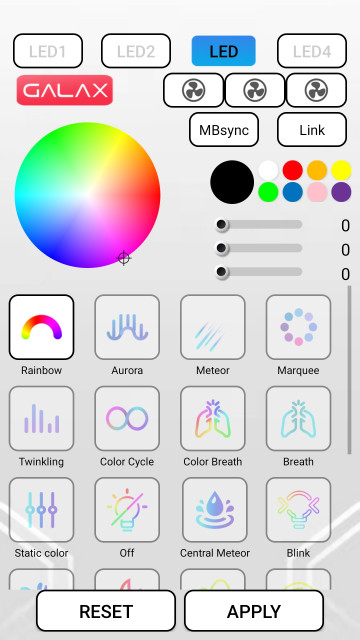 In diesem Abschnitt kann die Steuerung der RGB-Beleuchtung vorgenommen werden. Um die Grafikkarte stilvoll in Szene zu setzen bietet die Software in diesem Abschnitt einige automatische Muster sowie Einstellungen an. Über die Schaltfläche MBsync kann die Beleuchtung synchron mit dem restlichen System gestaltet werden, sofern mit dem mitgeliefertem Kabel eine Verbindung zwischen GPU und Mainboard hergestellt wurde.