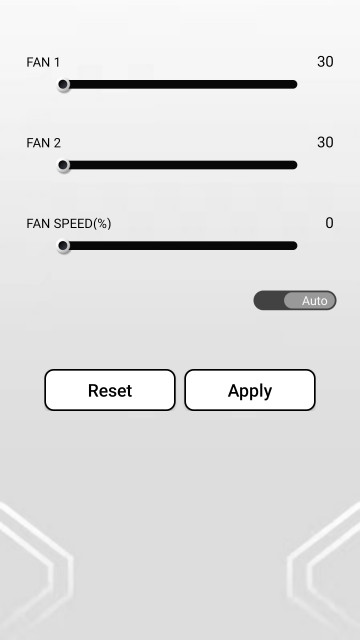 Im Abschnitt FAN können Einstellungen zum Lüfterverhalten vorgenommen werden. In der Übersicht kann grundsätzlich zwischen einer automatischen Steuerung, einer konstanten Drehzahl oder einer eigenen Lüfterkurve gewählt werden. Zur Einstellung einer eigenen Lüfterkurve können drei Punkte in einem Diagramm gesetzt werden, um eine Lüfterkurve einzustellen. Während die Art der Lüftersteuerung für beide Lüfter gleichzeitig gilt, können die jeweiligen Einstellungen für jeden der beiden Lüfter unterschiedlich gewählt werden.