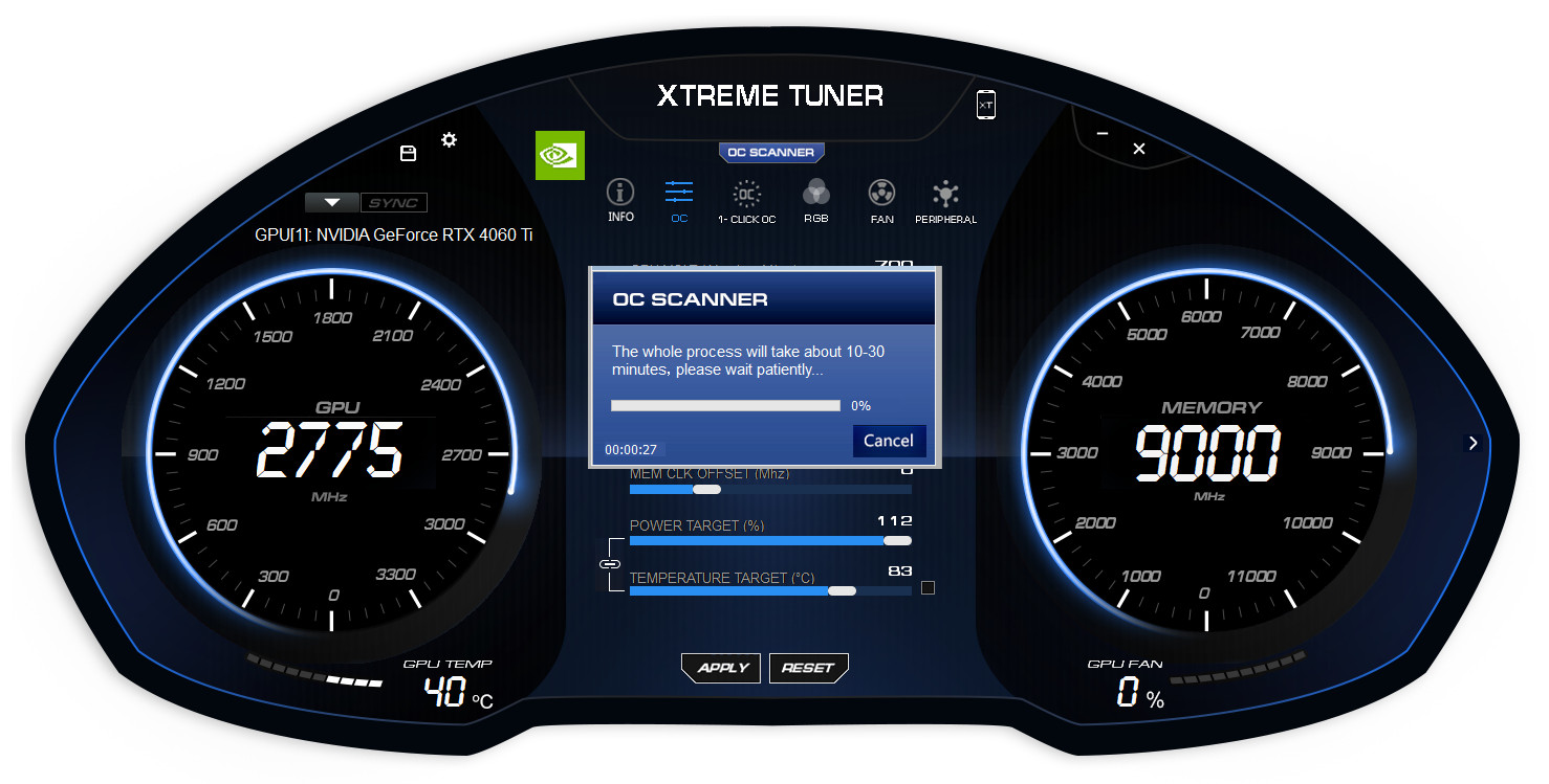 Im Bereich „OC“ können die Taktung und die Spannungen der GPU und des Speichers angepasst werden. Ebenso kann hier das Power Target zwischen 88 und 112% eingestellt werden, so dass das vorgesehene Power Target der Karte von 160 W auf 175 W erhöht werden kann. Auch das Temperatur Target kann hier eingestellt werden. Eine Schaltfläche weiter befindet sich der „1-Click-OC“ Button, mit dem der Boost Clock um 15 mHz erhöht werden kann. Zusätzlich bietet die Xtreme Tuner Software einen OC-Scanner, der die Taktung der GPU und des Speichers schrittweise erhöht und dabei die Stabilität testet. Auf diese Weise findet der OC Scanner die richtigen Einstellungen, um die Karte zu übertakten. In unserem Test lief der OC Scanner fast 40 Minuten durch. Am Ende gab die Software die Empfehlung den Takt um 165 MHz zu erhöhen, wodurch wir auf einen Boost-Takt von 2805 MHz kamen.