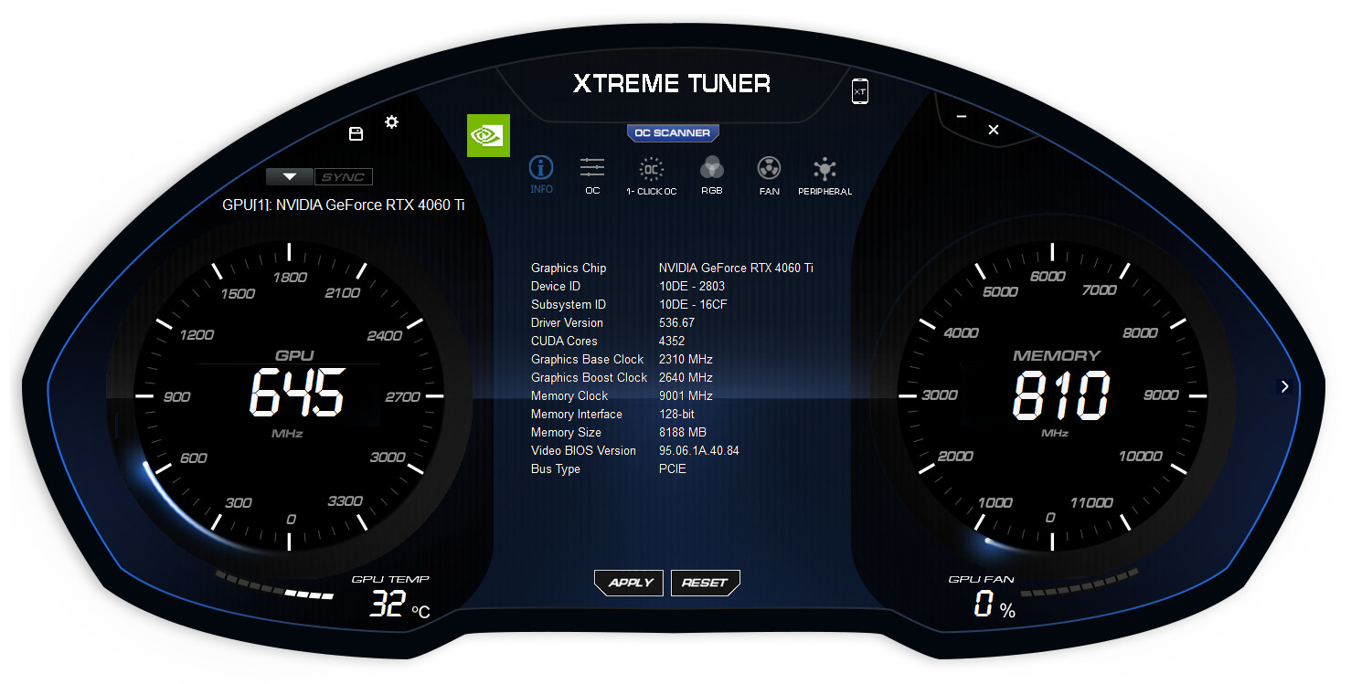 Als Begleitsoftware zu den KFA2-Grafikkarten bietet der Hersteller die Software „Xtreme Tuner“ an. Die Optik erinnert stark an die Geschwindigkeitsanzeigen eines Auto-Cockpits. Zwei Tachometer zeigen links die aktuelle Geschwindigkeit des Grafikprozessors und rechts und die Geschwindigkeit des Speichers an. Unter den Anzeigen wird die aktuelle Temperatur und die aktuelle Lüftergeschwindigkeit angezeigt. Das Element zwischen den beiden Anzeigen präsentiert in der „Info“-Ansicht einige technische Details zur Grafikkarte. Neben den aktuellen Basis- und Boost-Takten finden sich hier auch Informationen über den aktuell verwendeten Treiber, sowie die BIOS-Version der Grafikkarte. Im oberen Bereich befinden sich Schaltflächen für weitere Ansichten.
