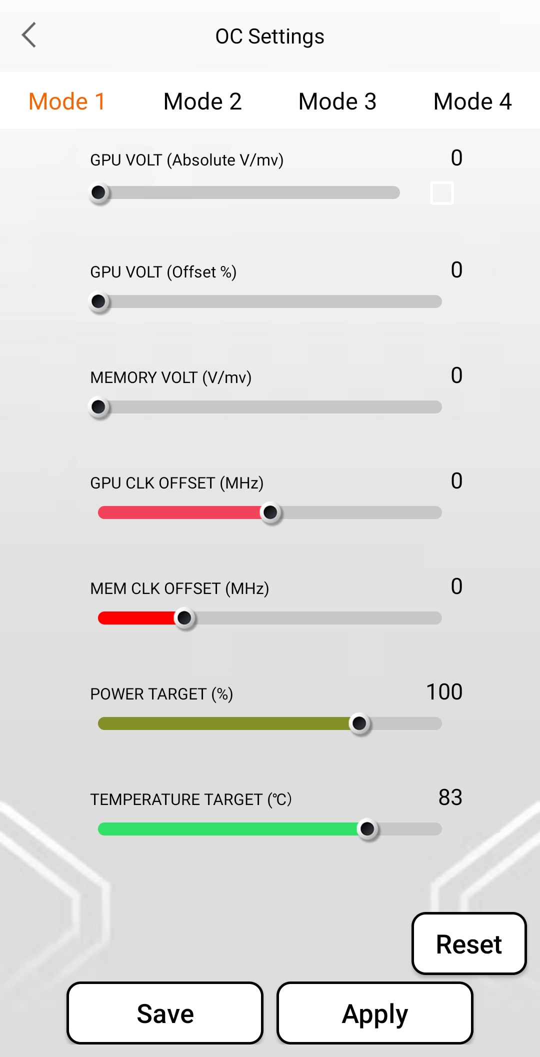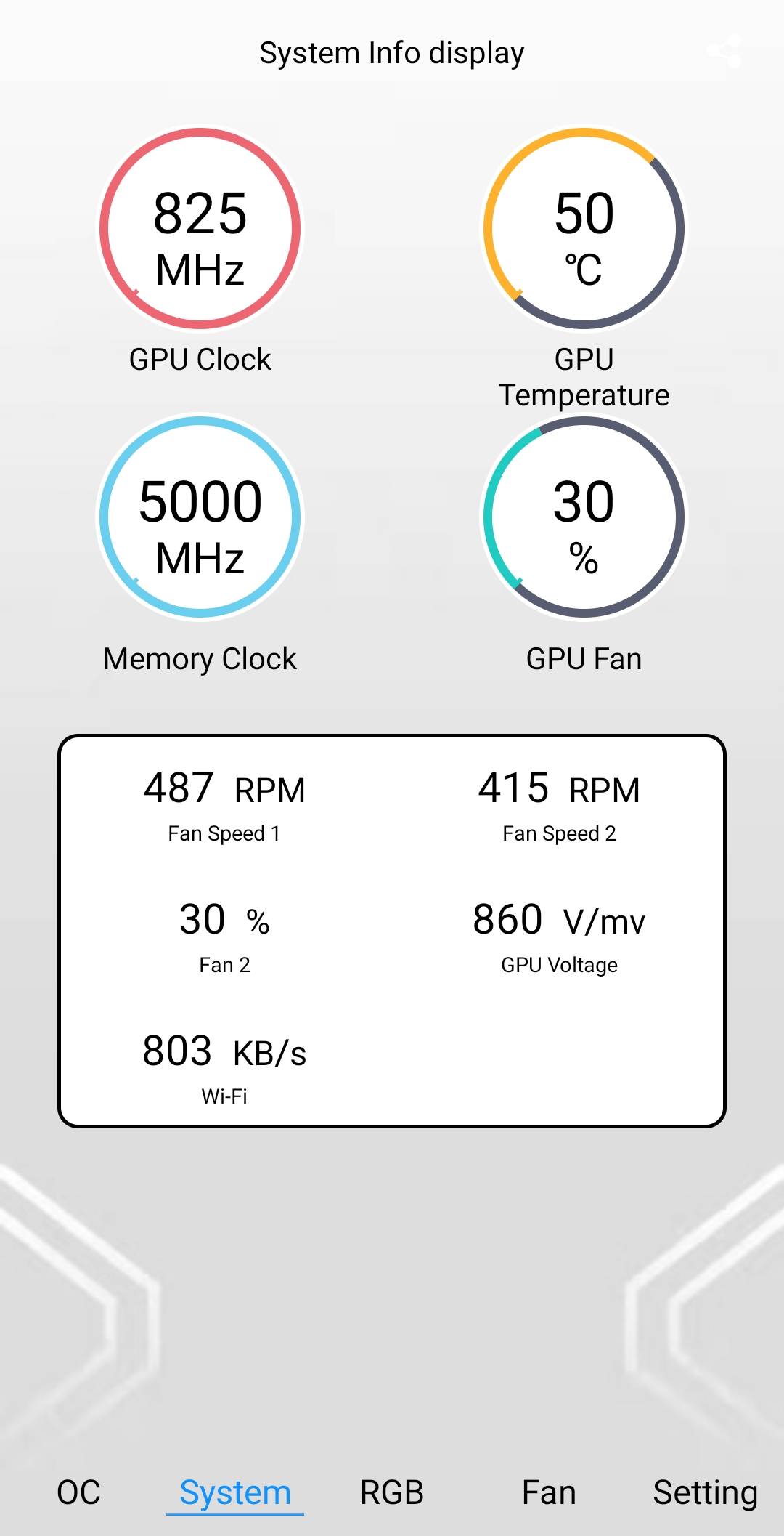 Grundsätzlich bietet die mobile App einen ähnlichen Funktionsumfang wie die PC-Variante. In der Übersicht werden die aktuellen GPU- und Speichertaktfrequenzen, die GPU-Temperatur, die Lüfterdrehzahlen und die aktuelle GPU-Spannung angezeigt. Die Einstellung der Lüfter erlaubt in der mobilen App nur die Einstellung auf konstante Geschwindigkeit oder Automatik. Den größten Funktionsumfang bietet die App bei der RGB-Beleuchtung. Hier können viele Muster ausgewählt werden, um eine stimmungsvolle Beleuchtung zu erreichen. Im Bereich OC bietet die App eine Besonderheit, die die PC-Anwendung nur indirekt ermöglicht: die Erstellung von Profilen der OC-Einstellungen. Hier zeigt die App gleich vier Profile an, in denen getrennt voneinander die Spannungen, die Taktraten sowie das Power Target und das Temperature Target eingestellt werden können. Über drei Buttons können die Profile gespeichert, übernommen oder zurückgesetzt werden.