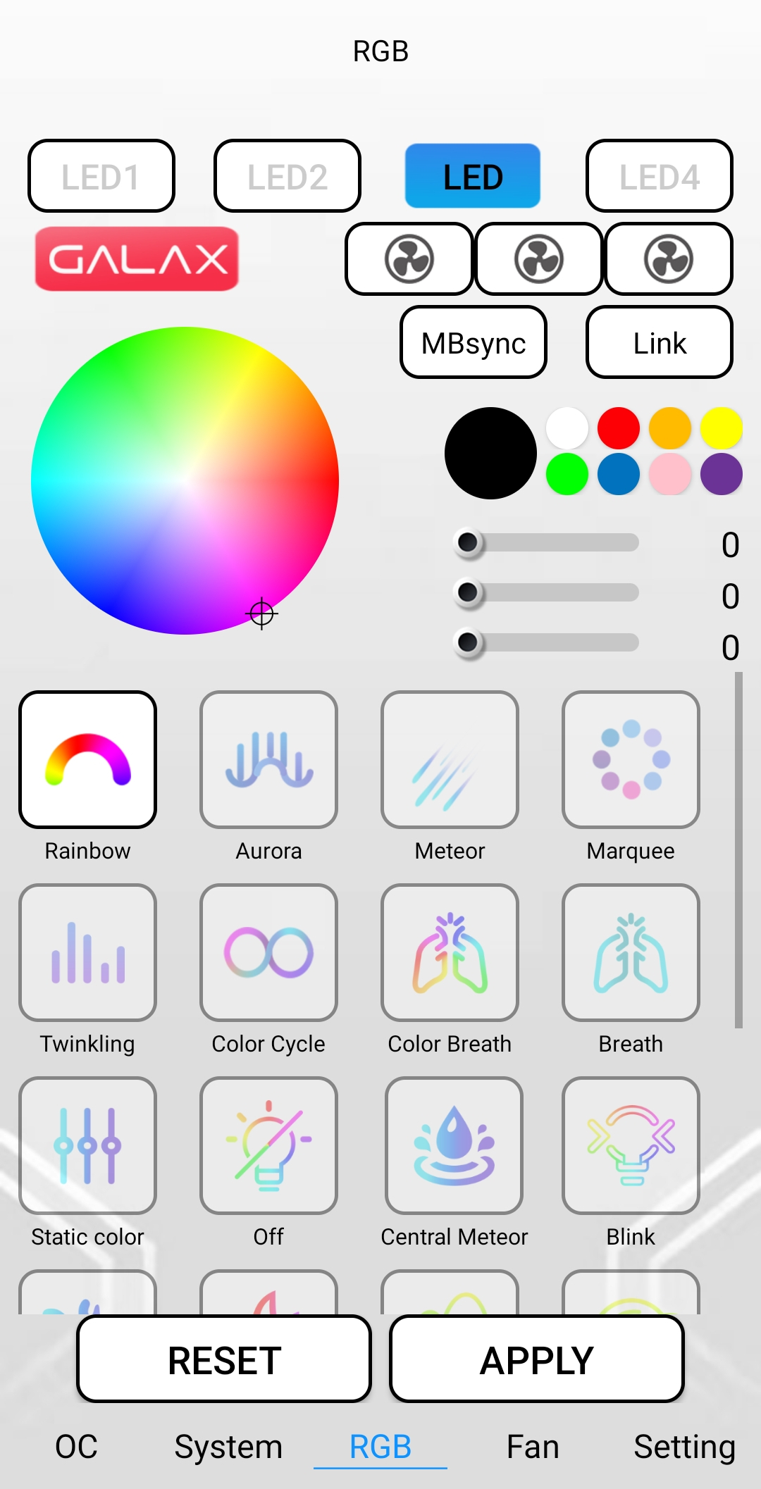 In diesem Abschnitt kann die Steuerung der RGB-Beleuchtung vorgenommen werden. Um die Grafikkarte stilvoll in Szene zu setzen bietet die Software in diesem Abschnitt einige automatische Muster sowie Einstellungen an. Über die Schaltfläche MBsync kann die Beleuchtung synchron mit dem restlichen System gestaltet werden, sofern mit dem mitgeliefertem Kabel eine Verbindung zwischen GPU und Mainboard hergestellt wurde.