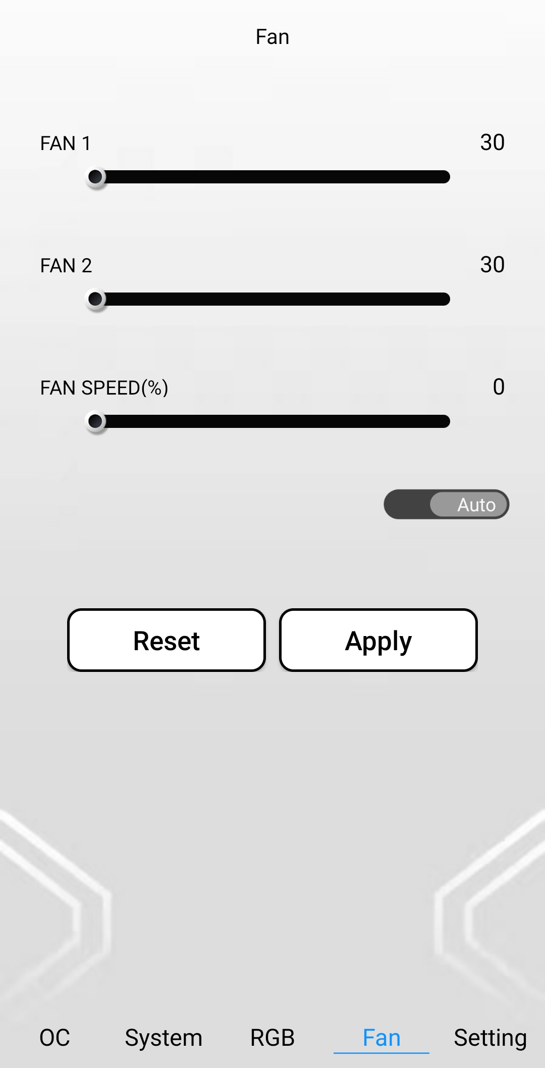 Im Abschnitt FAN können Einstellungen zum Lüfterverhalten vorgenommen werden. In der Übersicht kann grundsätzlich zwischen einer automatischen Steuerung, einer konstanten Drehzahl oder einer eigenen Lüfterkurve gewählt werden. Zur Einstellung einer eigenen Lüfterkurve können drei Punkte in einem Diagramm gesetzt werden, um eine Lüfterkurve einzustellen. Während die Art der Lüftersteuerung für beide Lüfter gleichzeitig gilt, können die jeweiligen Einstellungen für jeden der beiden Lüfter unterschiedlich gewählt werden.