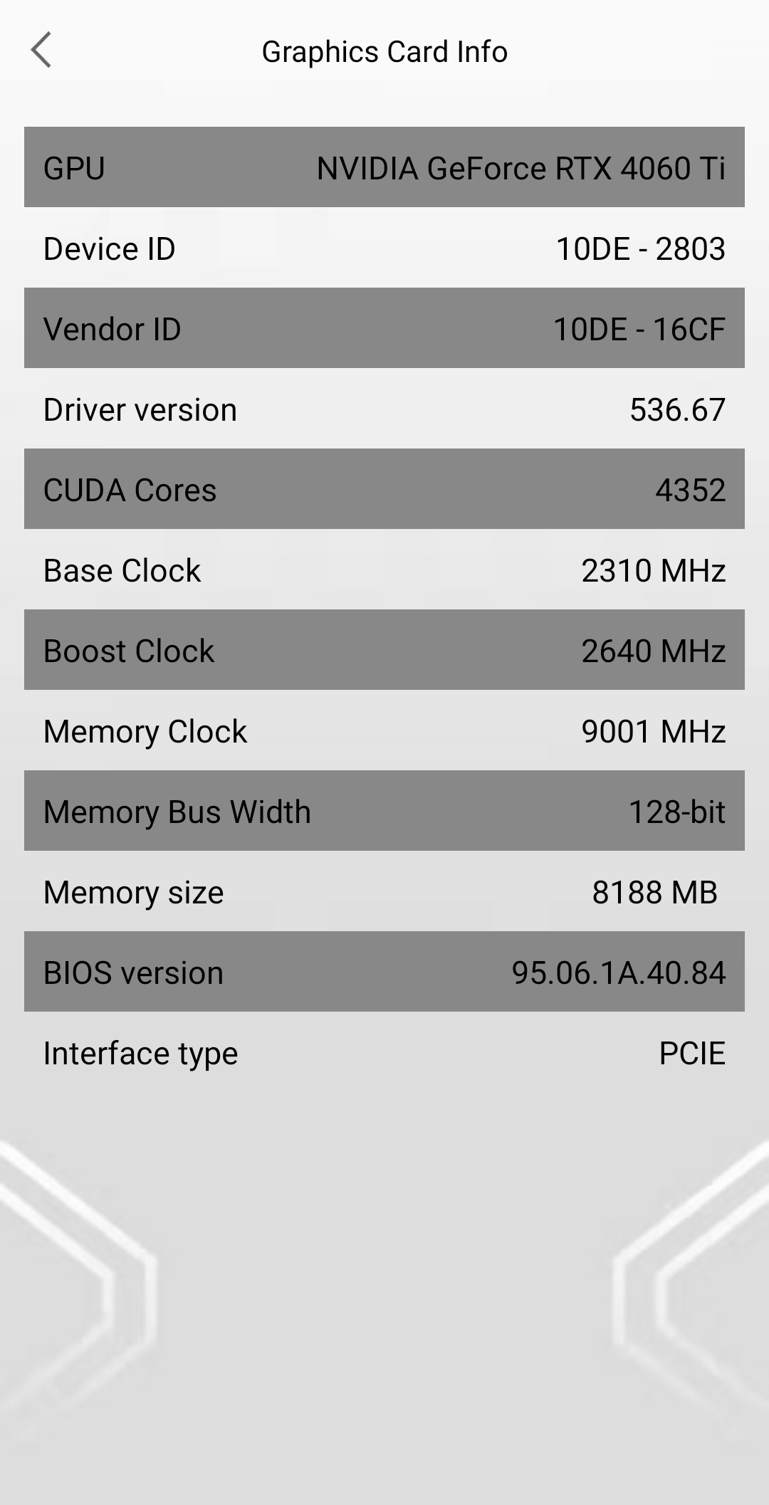 Mittels GPU-Z von techpowerup lesen wir die grundlegenden Eigenschaften der RTX 4060 TI aus. Der Basistakt der GPU liegt bei 2310 MHz und der Boosttakt bei 2640 MHz, der 1-Click-OC-Modus ist im Auslieferungszustand nicht aktiv. Als Speicher kommen 8192 MB GDDR6 Chips von Samsung zum Einsatz. Die Speicher sind mit einer Busbreite von 128 Bit angebunden und erreichen somit einen Datendurchsatz von 288 GB/s. Die Grafikkarte bietet Unterstützung für allerlei moderne Technologien wie Resizable Bar und Raytracing, unterstützt aber kein SLI.