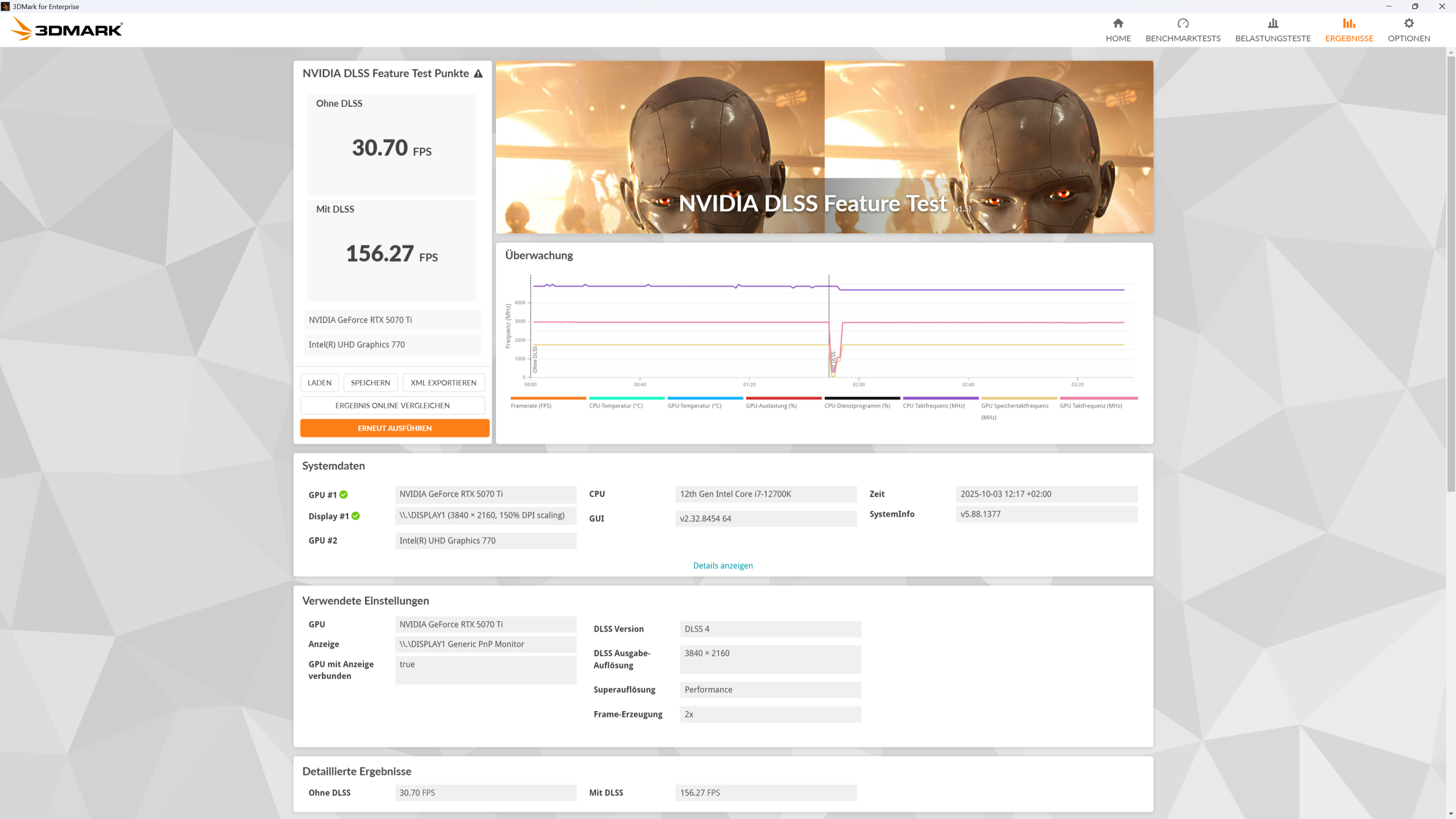 Um die AI-basierte Upscaling-Technologie der KFA2 GeForce RTX 5070 Ti Hall of Fame Black Edition zu prüfen, nutzen wir den NVIDIA DLSS Feature-Test. Dieser Benchmark bewertet, wie effizient die GPU DLSS in verschiedenen Qualitätsmodi (Quality, Balanced, Performance) verarbeitet und welche Auswirkungen dies auf die Bildrate und Bildqualität hat. Besonders interessant ist die Bewertung in Kombination mit aktiviertem Raytracing, da hier die Leistungsreserven der RT- und Tensor-Kerne auf die Probe gestellt werden.