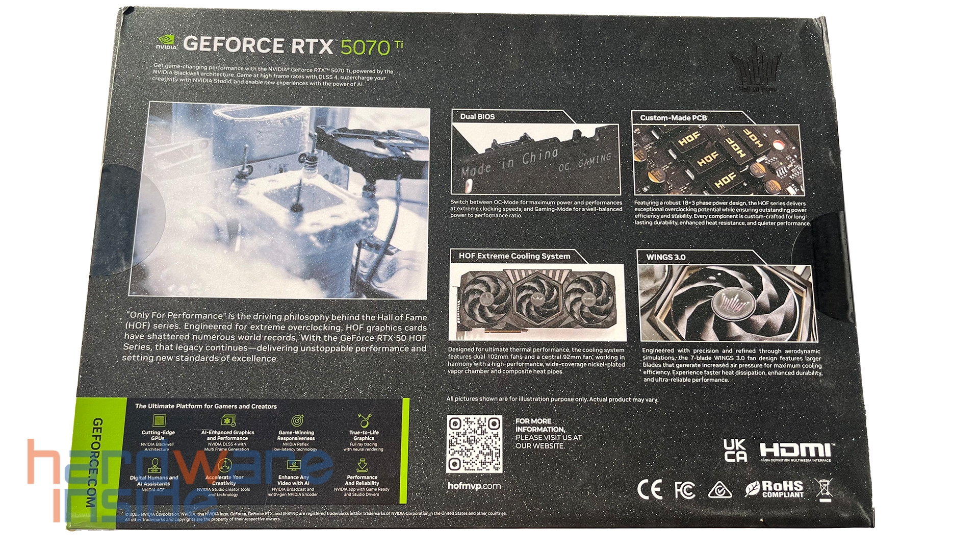 Beim Öffnen der Verpackung der KFA2 GeForce RTX 5070 Ti Hall of Fame Black Edition bestätigt sich der Premium-Anspruch, den bereits das äußere Design vermittelt. Öffnet man die Außenverpackung, kommt zunächst eine edel gestaltete Innenbox zum Vorschein, die die HOF-Krone in glänzendem Schwarz, und die Aufschrift „ONLY FOR PERFORMANCE“ trägt. Schon dieser erste Schritt erinnert mehr an das Öffnen eines Sammlerstücks als an das Auspacken einer Standard-Grafikkarte.