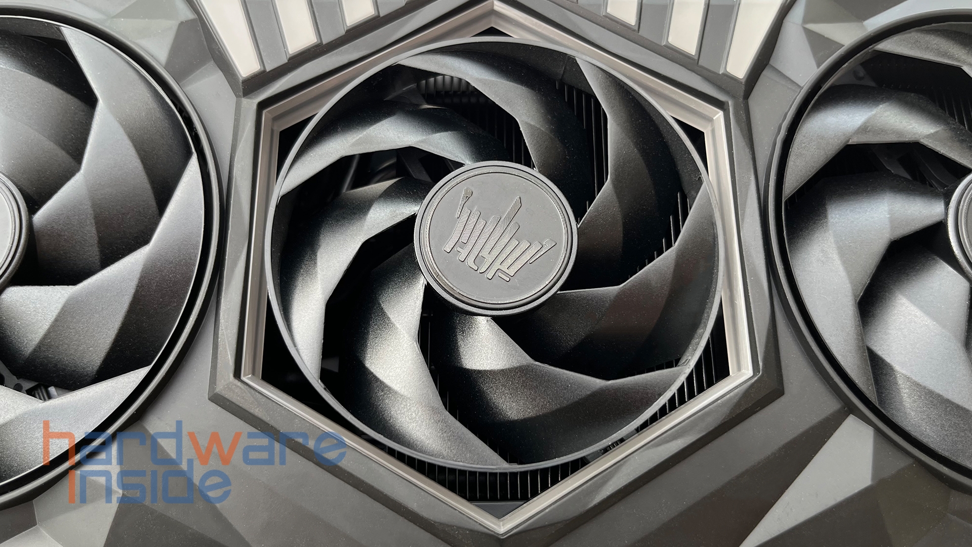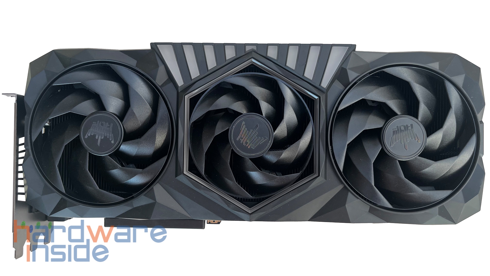 Im Mittelpunkt des Designs steht das markante Lüfter-Trio. Zwei äußere 102-mm-Lüfter flankieren einen etwas kleineren 92-mm-Lüfter in der Mitte – das charakteristische WINGS-3.0-Design von KFA2. Die Rotorblätter sind halbtransparent und von einem feinen ARGB-Ring umrahmt, der im Betrieb für eine gleichmäßige, stilvolle Beleuchtung sorgt. Durch die unterschiedliche Größe der Lüfter entsteht ein auffälliger Look, der gleichzeitig auf eine optimierte Luftführung hindeutet. Natürlich darf das legendäre HOF-Branding nicht fehlen: Auf der Front prangt mittig das Kronen-Emblem hervor, während an den Seiten und auf der Backplate großflächig das „Hall of Fame“-Logo zu finden ist.