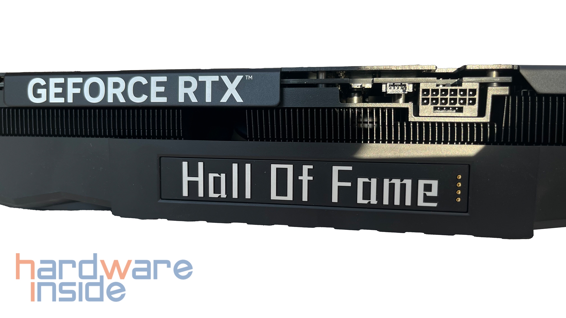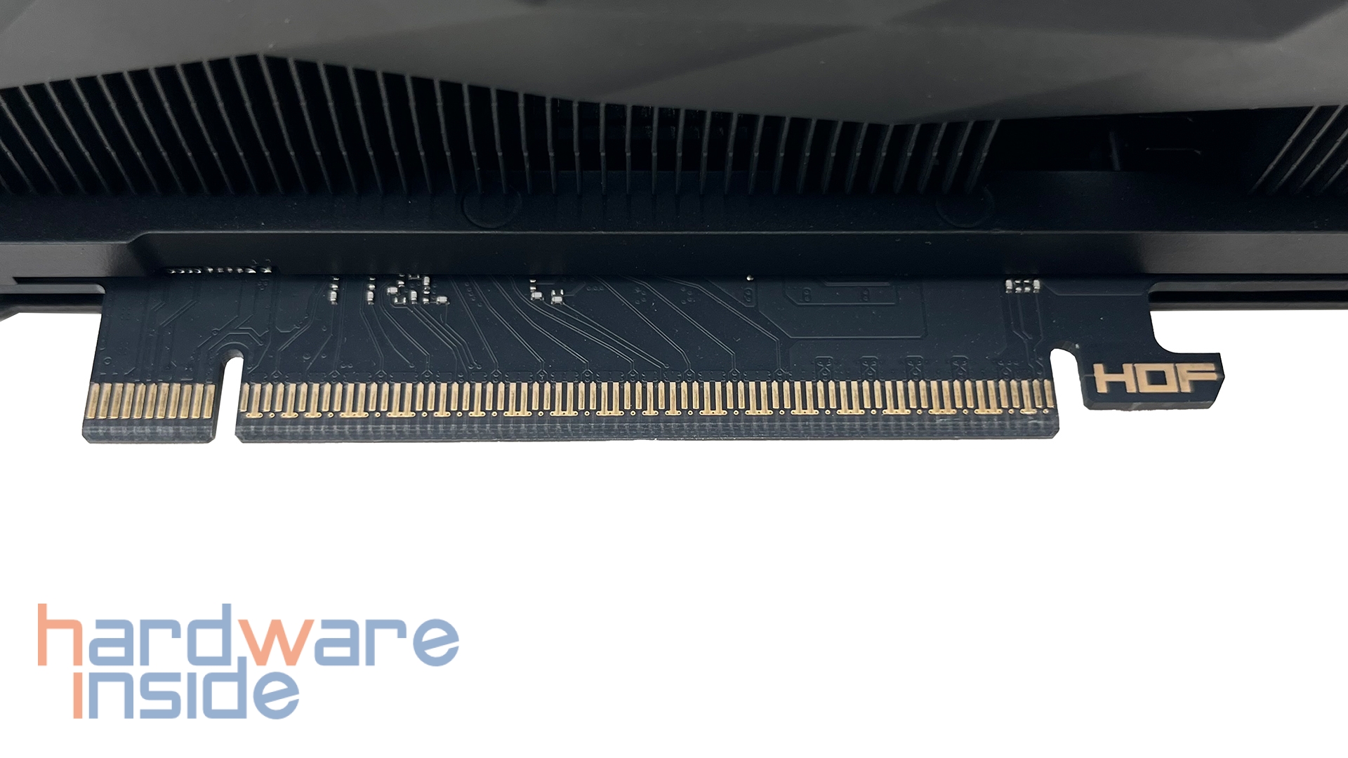 Die KFA2 GeForce RTX 5070 Ti Hall of Fame Black Edition setzt auf den aktuellen PCIe 5.0 x16-Standard. Damit steht der Karte die volle Bandbreite der neuesten Generation zur Verfügung, auch wenn sie in der Praxis selbst auf PCIe 4.0-Systemen kaum ausgebremst wird. Der Anschluss ist hochwertig verarbeitet und zeigt im Detail auch hier wieder die Identifikation mit HOF.