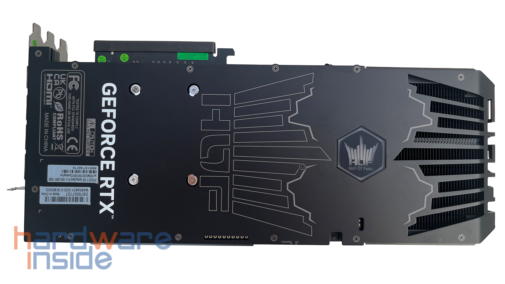 Die Rückseite der Karte wird von einer massiven Metall-Backplate dominiert, die nicht nur zur Stabilität beiträgt, sondern auch optisch eine zentrale Rolle spielt. Schon beim ersten Blick erkennt man die typische Handschrift der HOF-Serie: großflächig ragt das ikonische „Hall of Fame“-Logo in kontrastierendem Silber hervor, und wird von dem markanten Kronen-Emblem flankiert. In einer Spiegelachse wird die Backplate im Kronenmuster ausgeschnitten. Diese Wiedererkennungsmerkmale haben seit Jahren Kultstatus und sorgen dafür, dass man auch ohne Umwege sofort erkennt: Hier steckt eine HOF-Karte im System.