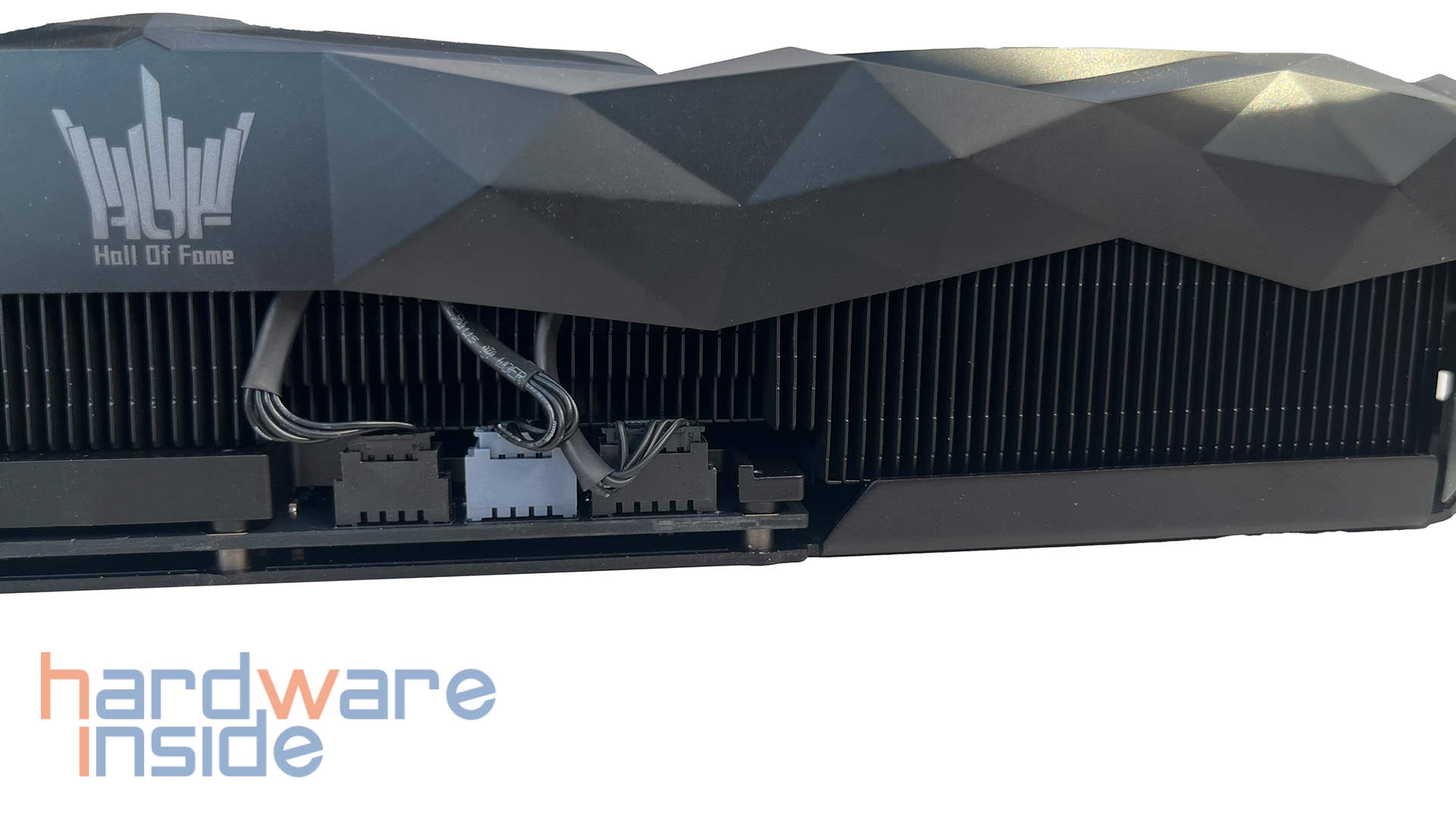 Ein Blick auf die Stromversorgung verrät sofort, dass KFA2 die Hall of Fame Black Edition nicht für Durchschnittsnutzer, sondern für Enthusiasten entwickelt hat. Der Anschluss erfolgt über den modernen 16-Pin PCIe-Gen5-Stecker, der eine saubere und stabile Stromzufuhr sicherstellt. Aber keine Sorge, falls eurer Netzteil dieses Format noch nicht unterstützt, liegt ein 16-Pin auf 3×8 Pin im Lieferumfang mit bei.