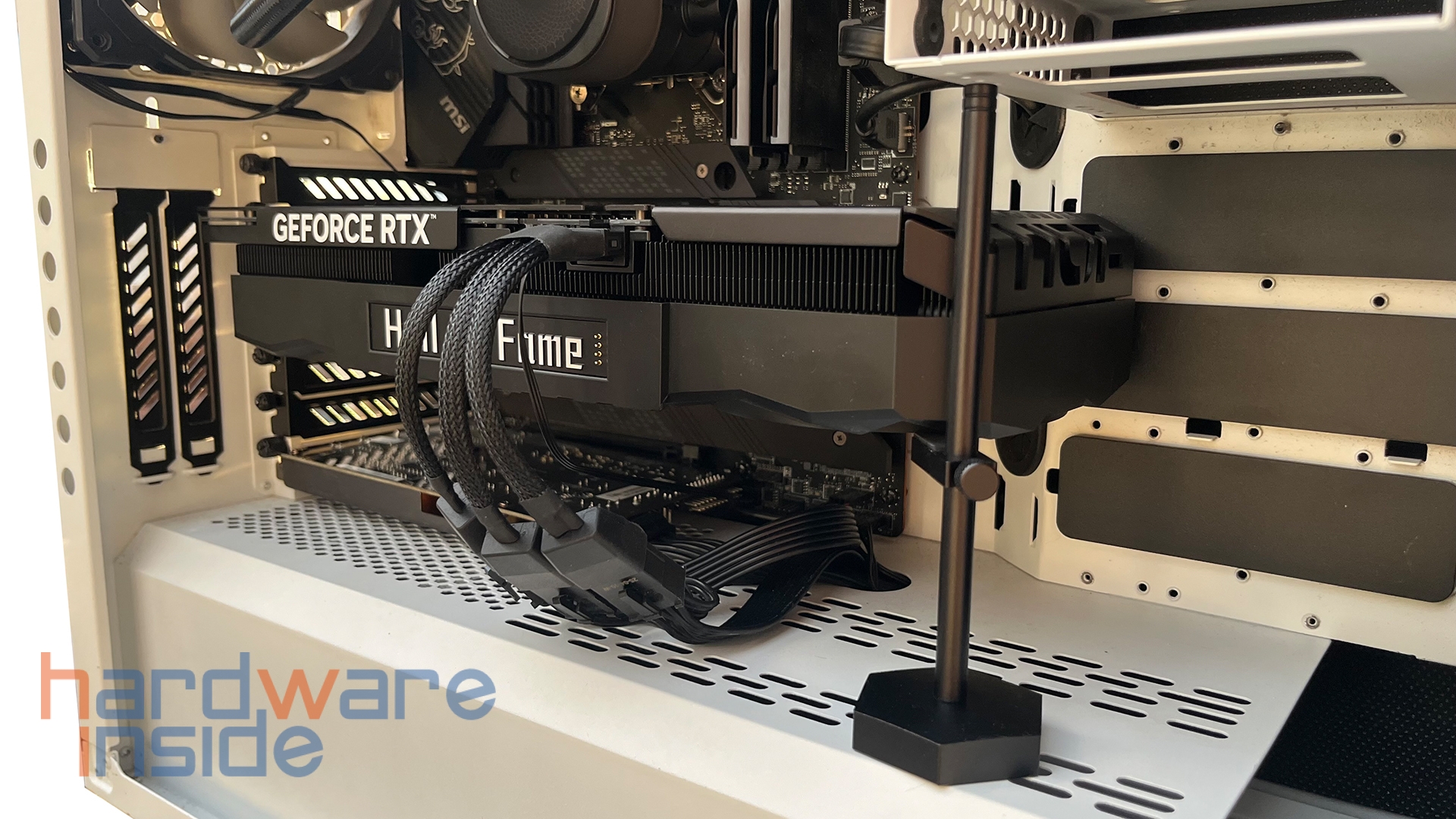 Die Montage der KFA2 GeForce RTX 5070 Ti Hall of Fame Black Edition gestaltet sich trotz ihrer massiven Dimensionen unkompliziert, erfordert jedoch etwas Planung. Mit knapp 35 cm Länge und einer Bauhöhe von drei Slots beansprucht die Karte viel Platz, weshalb ein großzügiges Gehäuse Pflicht ist. Auch das Gewicht ist nicht zu unterschätzen – hier zeigt sich der Vorteil des beigelegten GPU-Ständers, der die Karte zuverlässig abstützt und ein Durchbiegen im PCIe-Slot verhindert.