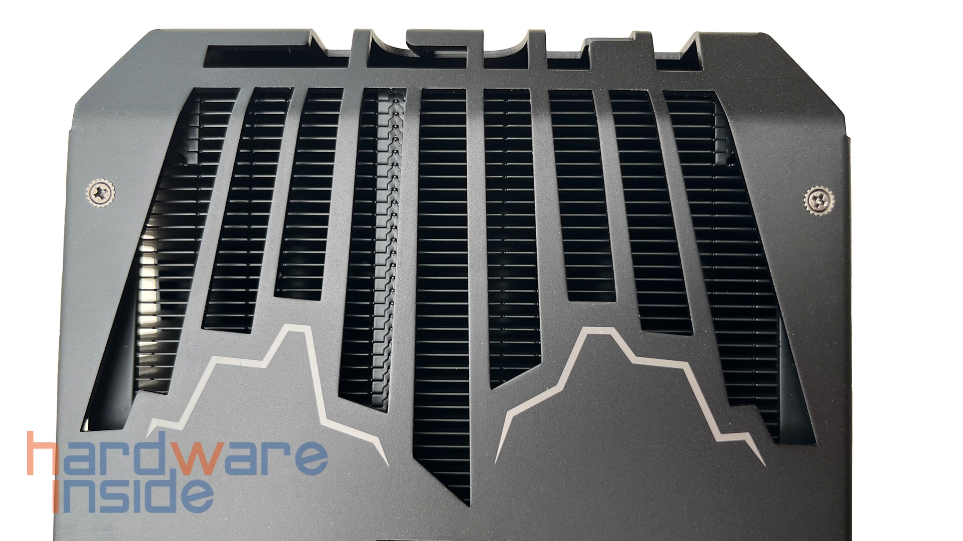 Das markante Drei-Lüfter-Design (WINGS 3.0) spielt dabei seine ganze Stärke aus: Zwei große 102-mm-Lüfter außen sorgen für hohen Luftdurchsatz, während der mittig platzierte 92-mm-Lüfter mit erhöhter Drehzahl gezielt die zentrale Zone der Karte abdeckt. Diese asymmetrische Konfiguration reduziert Hotspots und garantiert eine gleichmäßige Kühlung über die gesamte Platine hinweg. Auch die Backplate übernimmt mehr als nur eine optische Funktion: Sie ist aus massivem Metall gefertigt und mit Wärmeleitpads versehen, um die Rückseite der Spannungswandler und Speicherchips aktiv in das Kühlkonzept einzubeziehen. Lüftungsöffnungen in der Backplate ermöglichen zudem, dass ein Teil der Luft durch den Lamellenblock hindurchgeleitet wird – ein Prinzip, das den Luftstrom im Gehäuse effizient nutzt.