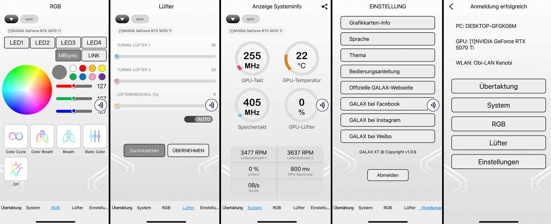 Neben der Desktop-Software bietet KFA2 eine App für Smartphones, mit der sich die Grafikkarte auch mobil überwachen und steuern lässt. Über die App können Nutzer nicht nur Temperaturen, Taktraten und Lüftergeschwindigkeiten einsehen, sondern auch ARGB-Beleuchtungseffekte synchronisieren und zwischen BIOS-Profilen wechseln. Besonders praktisch: Die App ermöglicht schnelle Anpassungen, ohne dass der Rechner geöffnet oder die Software gestartet werden muss – ideal für Overclocking-Tests oder schnelle Anpassungen während des Gaming-Betriebs. Die Verbindung erfolgt unkompliziert über WLAN und die App ist sowohl für iOS als auch Android verfügbar. Die Integration ins System ist nahtlos, sodass Änderungen in Echtzeit auf die Karte übertragen werden. Für Enthusiasten, die ihre GPU permanent überwachen oder optisch perfekt ins Setup integrieren wollen, ist die App ein sinnvolles Zusatztool, das Flexibilität und Komfort bietet.