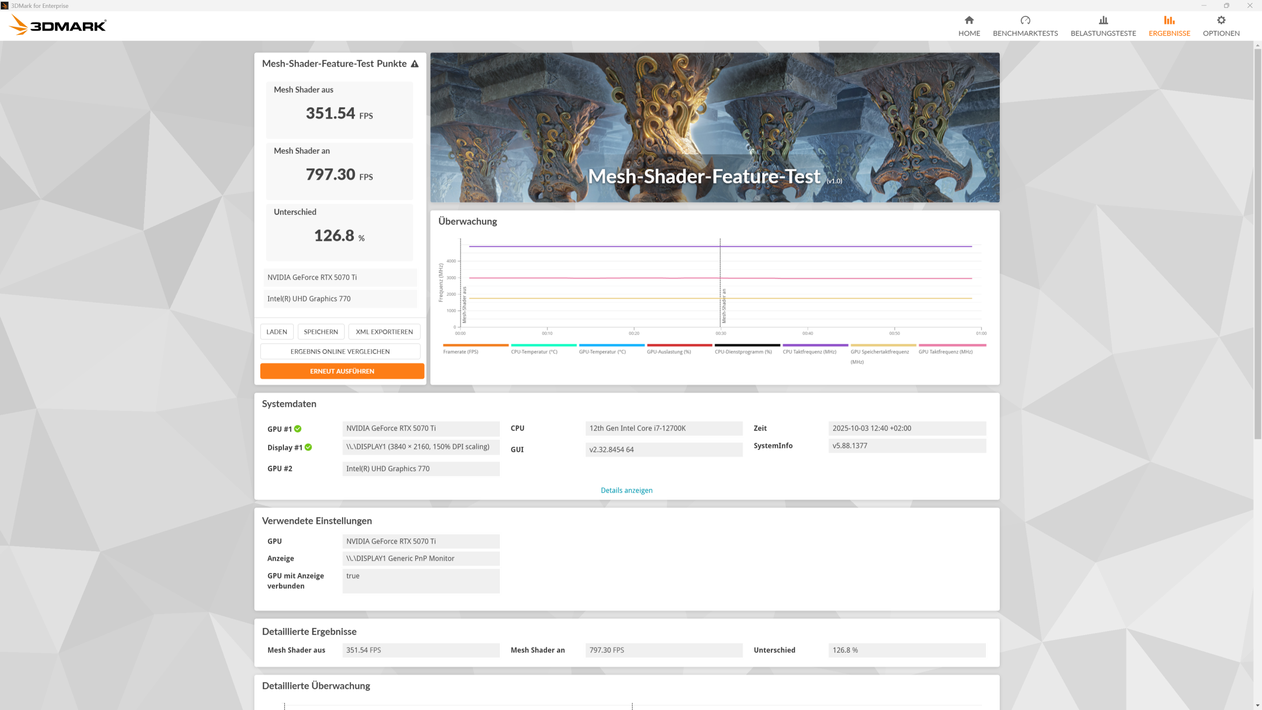 Der Mesh Shader Feature-Test von 3DMark überprüft die Fähigkeit der GPU, moderne Geometrie-Shader-Technologien effizient zu verarbeiten. Mesh Shaders ermöglichen eine deutlich flexiblere und parallele Berechnung von Geometrie, was in komplexen Szenen zu besseren Performancewerten bei gleicher Detailtiefe führt. Dieser Test ist besonders relevant für zukünftige Spiele und Anwendungen, die stark auf neue DirectX-12-Funktionen setzen.