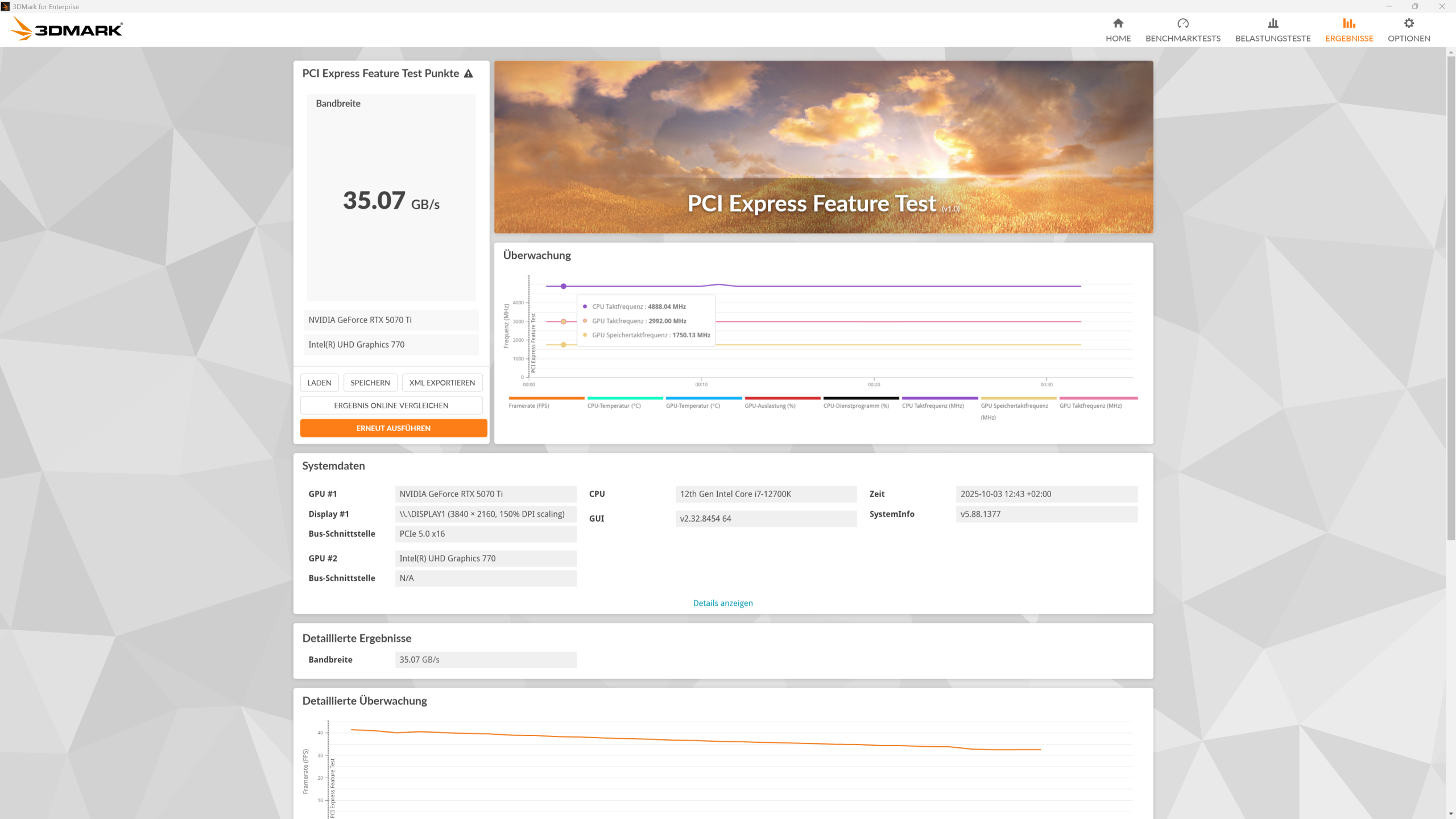 Abschließend werfen wir einen Blick auf den PCI Express Feature Test, um die Anbindung der KFA2 GeForce RTX 5070 Ti Hall of Fame Black Edition an den Systembus zu prüfen. Die Karte unterstützt PCIe 5.0 x16, was eine theoretische Bandbreite von bis zu 63,0 GB/s bietet – die doppelte Bandbreite von PCIe 4.0 x16, welche bei 31,5 GB/s liegt. Damit ist die Karte bestens gerüstet für zukünftige Anforderungen moderner Grafikkarten- und Speichertechnologien. Selbst auf PCIe-4.0-Systemen zeigt sich die GPU kaum ausgebremst, da die Bandbreite bereits für aktuelle Spiele und Benchmarks mehr als ausreichend ist.