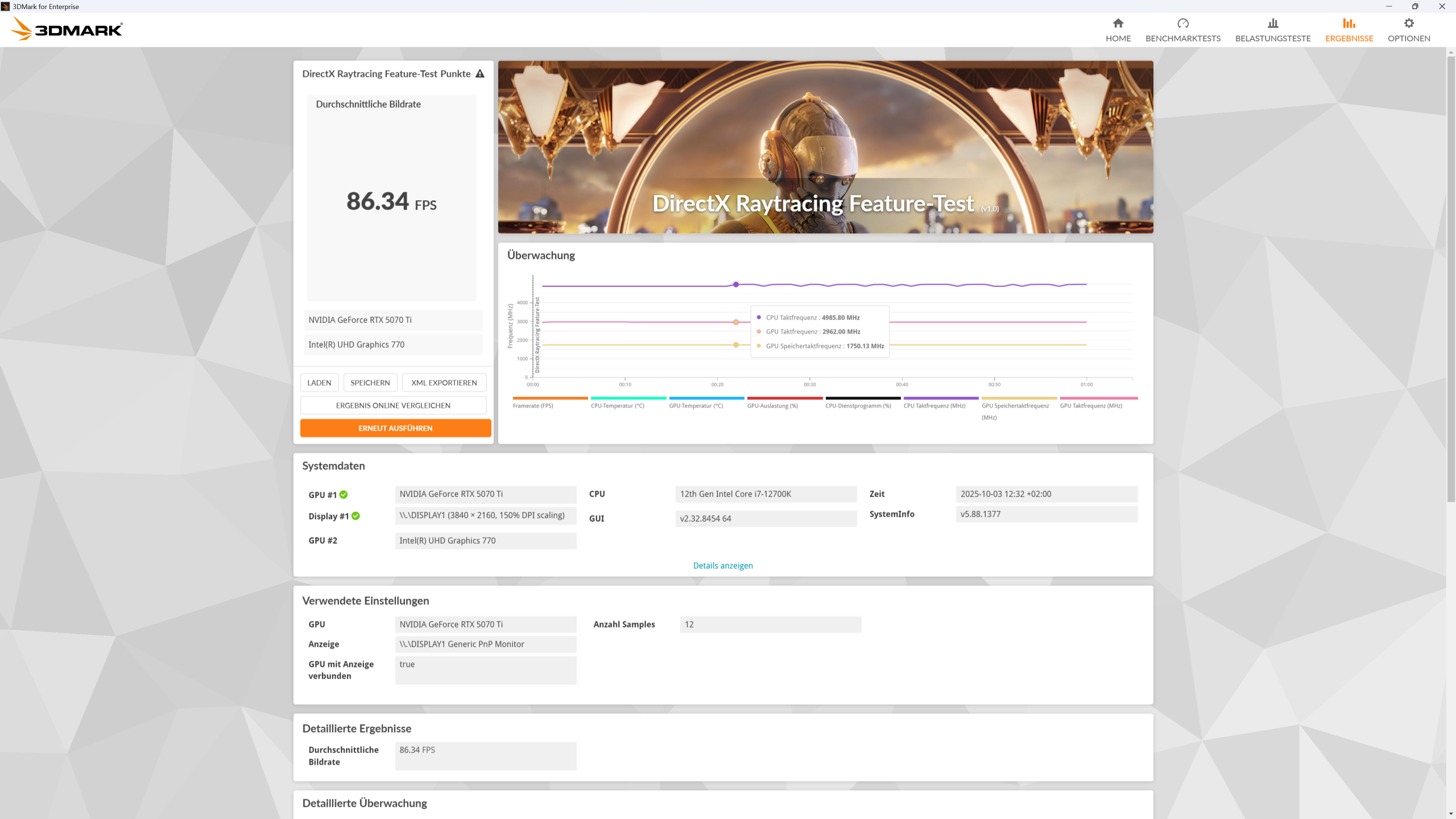 Um die Raytracing-Fähigkeiten der KFA2 GeForce RTX 5070 Ti Hall of Fame Black Edition gezielt zu überprüfen, nutzen wir den 3DMark Raytracing Feature-Test. Dieser Benchmark fokussiert sich auf die Leistung der RT-Kerne in Szenen mit Echtzeit-Spiegelungen, Schatten und globaler Beleuchtung. Ziel ist es, sowohl die Effizienz als auch die Stabilität der Karte bei aktiviertem Raytracing zu beurteilen, ohne dass der CPU-Anteil die Messung verfälscht.