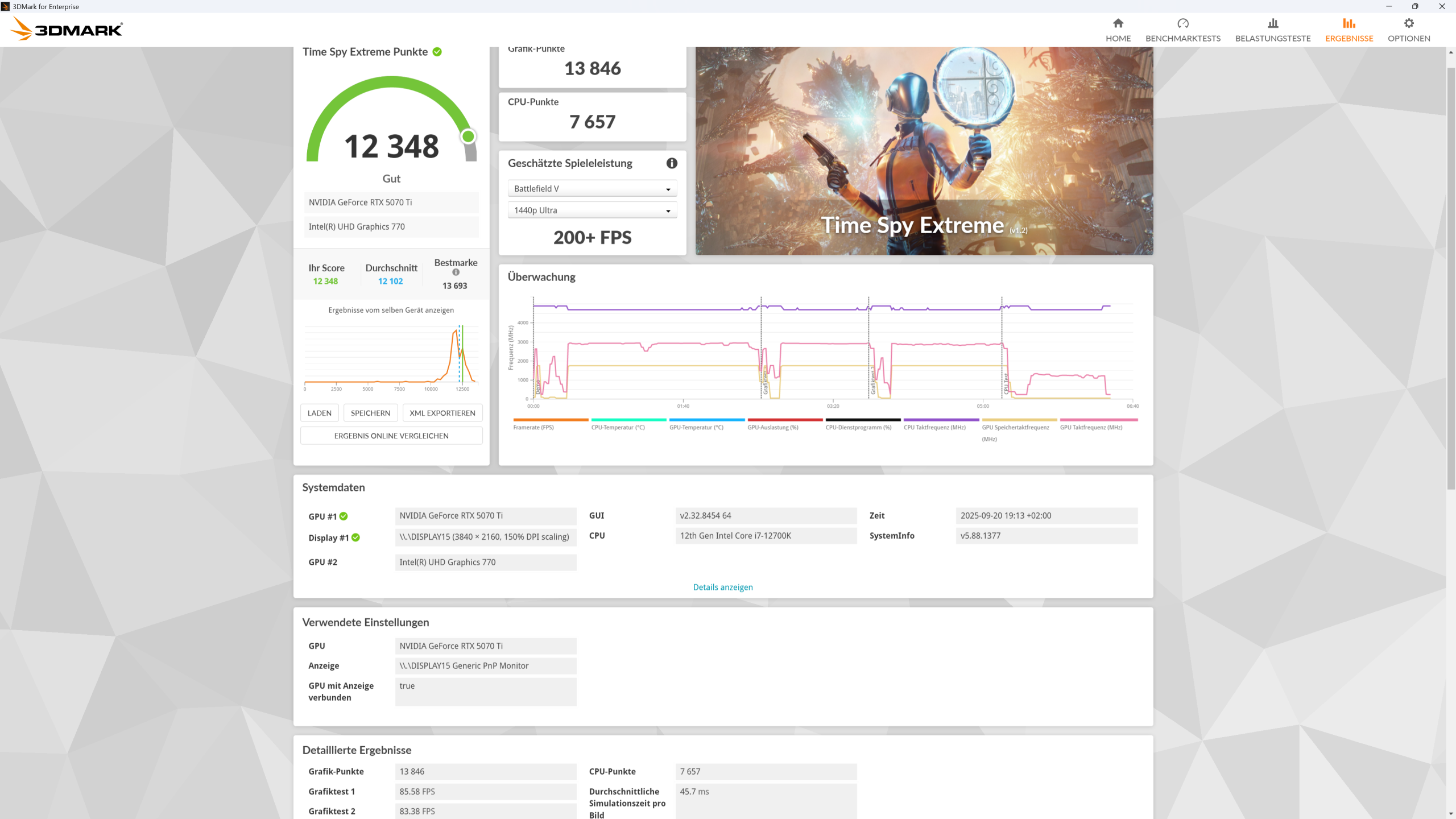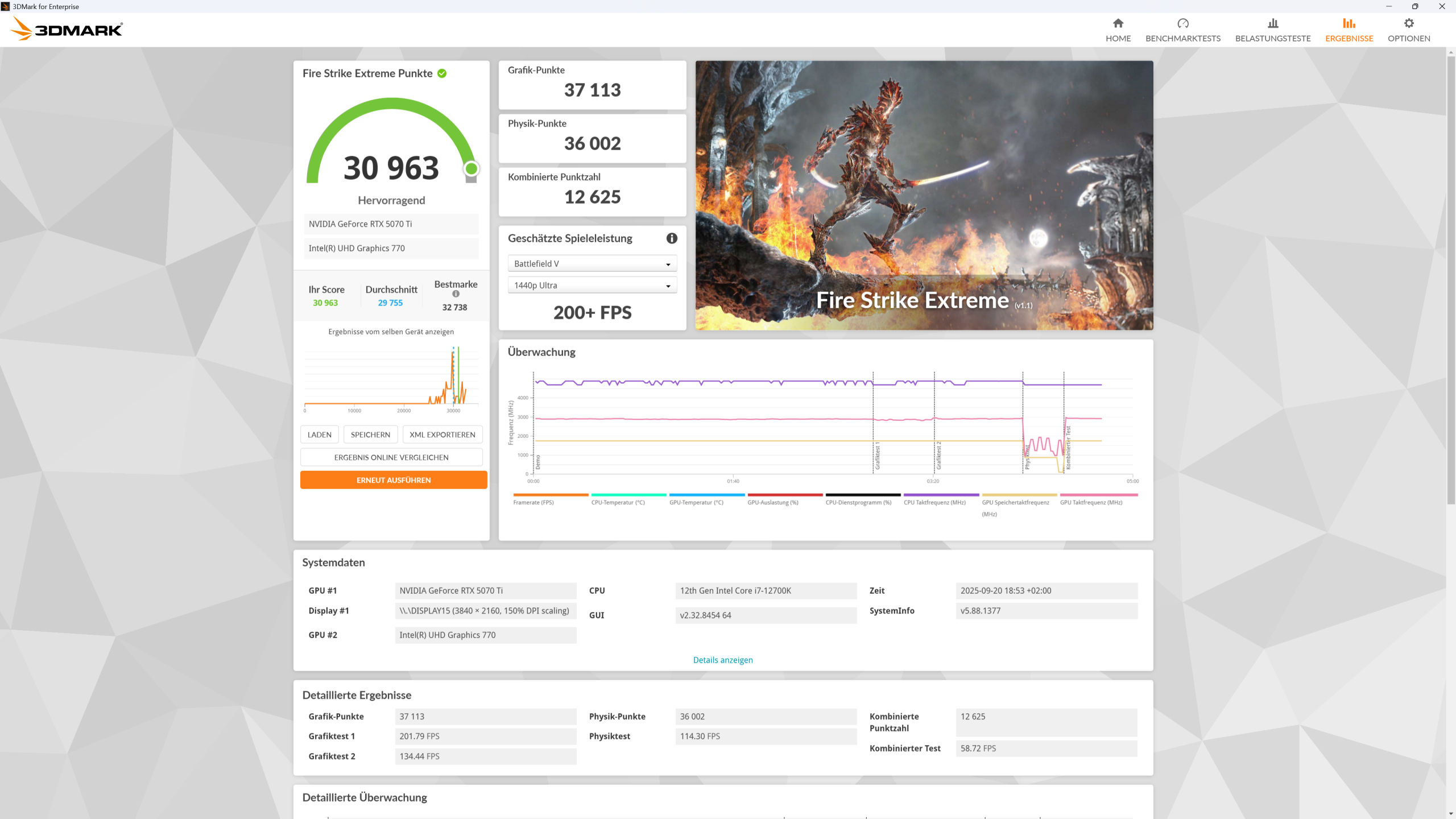Die KFA2 GeForce RTX 5070 Ti Hall of Fame Black Edition zeigt in diesem Test ihre Stärken: Wir erzielen ein hervorragendes Ergebnis von knapp 31.000 Punkten. Fire Strike Extreme eignet sich besonders, um die Karte mit anderen High-End-GPUs der vorherigen Generation zu vergleichen. Eine 3070 Ti lieferte in diesem Test ihrerzeit noch knapp 17.800 Punkte.