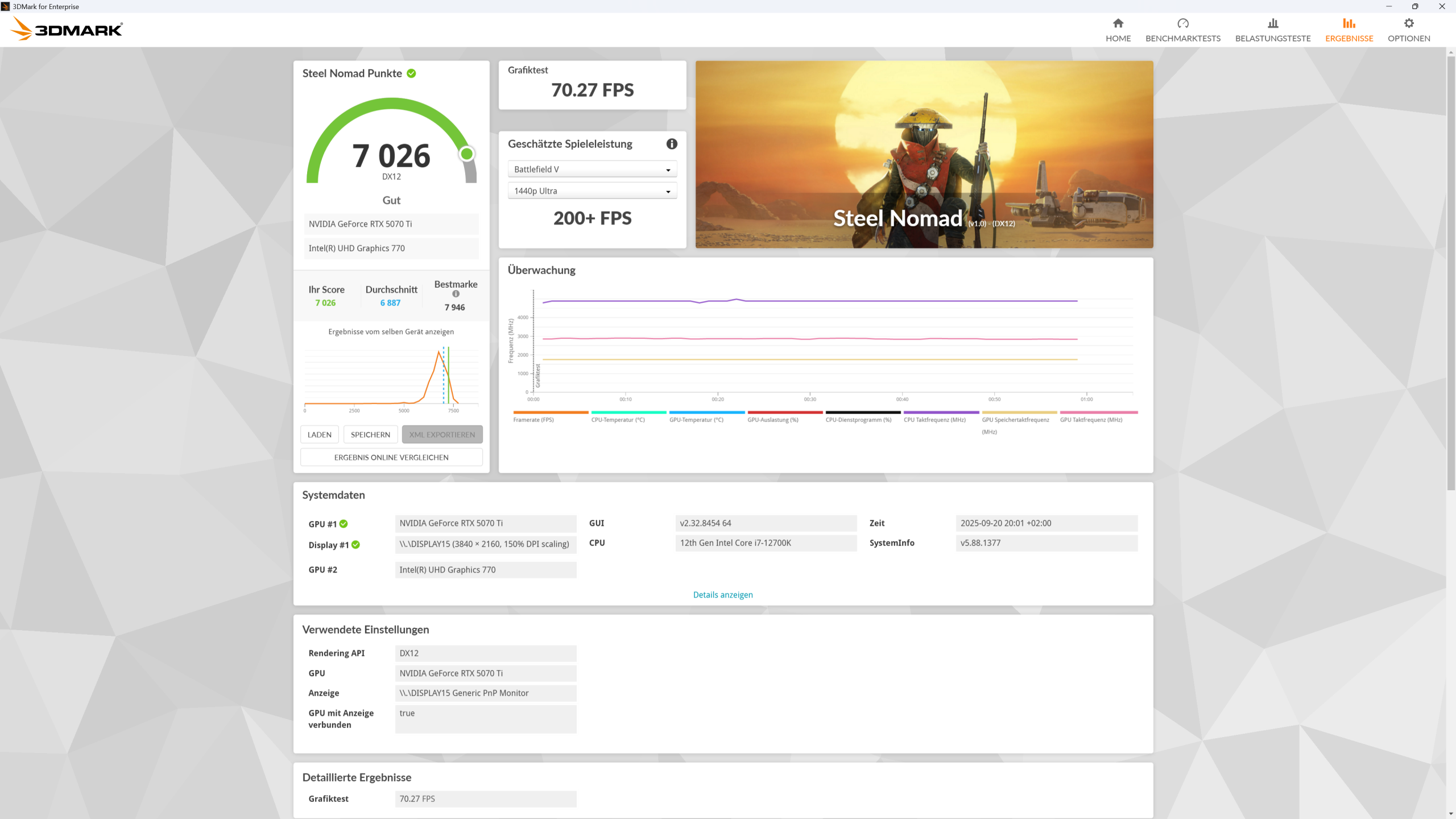 Zusätzlich zu den synthetischen 3DMark-Tests haben wir die KFA2 GeForce RTX 5070 Ti Hall of Fame Black Edition auch im Steel Nomad Benchmark geprüft. Dieses Tool simuliert moderne AAA-Titel mit hohen Texturdetails, komplexen Shader-Effekten und realistischer Physikberechnung. Steel Nomad ist besonders praxisnah und gibt einen guten Eindruck davon, wie sich die Karte in aktuellen Spielen unter Volllast verhält.