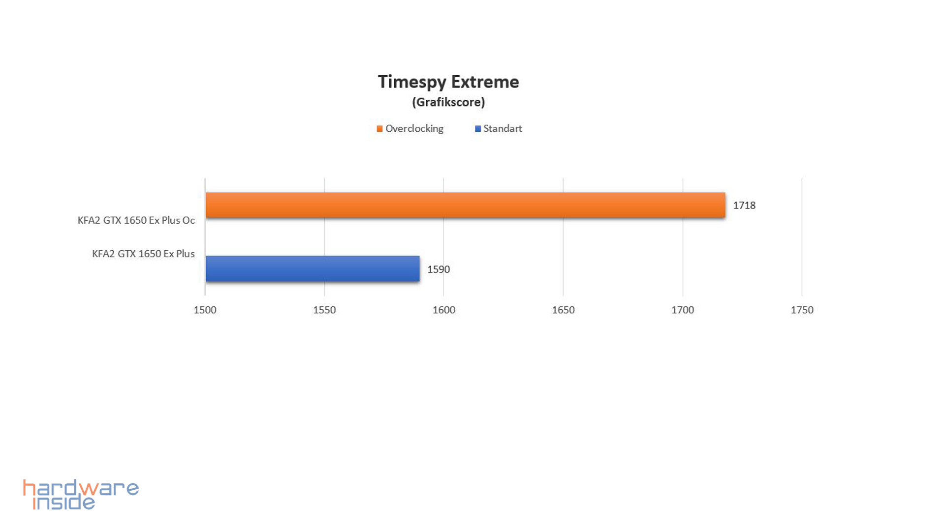 In 3DMark Timespy Extreme erreicht die KFA2 EX Plus ohne Übertaktung 1671 Punkte und mit Übertaktung 1884 Punkte. Mit Übertaktung erreichen wir circa 8 % mehr Leistung.