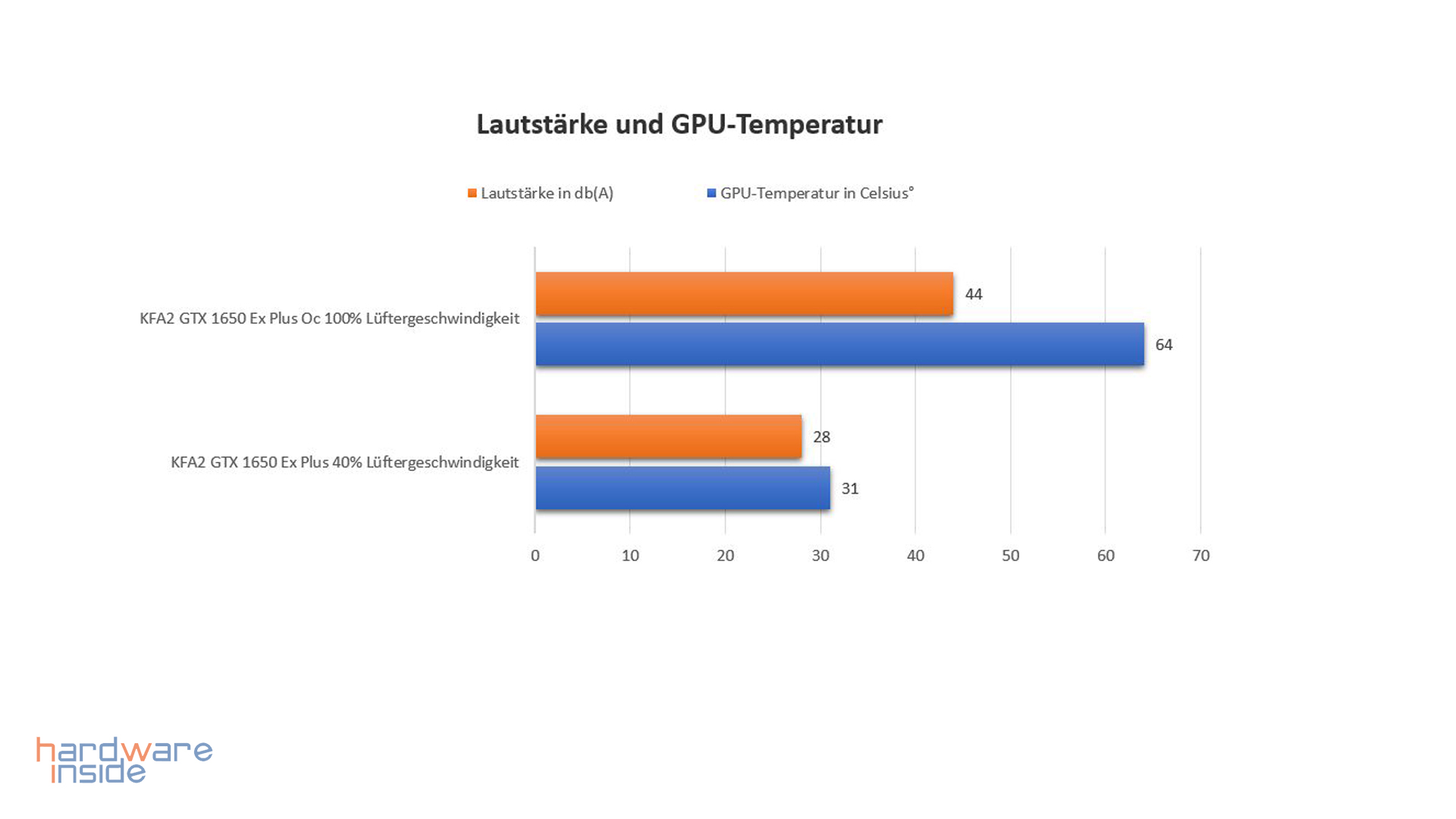 Wie bereits erwähnt, fördert die Dualslotkühlung von Kfa2 mit den bewährten 2 x 80 mm Axial Lüftern die entstandene Abwärme gut ab. Bei 64 °C unter Last und 40 % Lüftergeschwindigkeit lagen wir bei einer Lautstärke von ca. 28dB(A), was absolut ok ist. Bei 100 % hingegen lagen wir aber bei schon 44 dB(A).