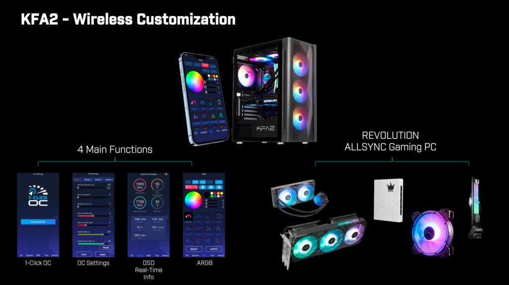Als langjähriger Anbieter verschiedenster Hardware-Komponenten möchte Hersteller KFA2 das Konzept seiner PC-Gehäuse mit der REVOLUTION ALLSYNQ Serie neu definieren. Künftig sollen Anwender über die exklusive Xtreme Tuner Plus Software und auch online via Smartphone über die mobile, drahtlose KFA2 Xtreme Tuner App (für Android und iOS) die gewünschten RGB-Effekte des Gehäuses perfekt einstellen können. Dafür ist das brandneue PC-Gehäuse REVOLUTION-06 ALLSYNQ (REV-06 AS) von KFA2 voll kompatibel mit der „HOF Control Box“, die eine kabellose Synchronisierung aller ARGB-Effekte des gesamten Systems bietet.