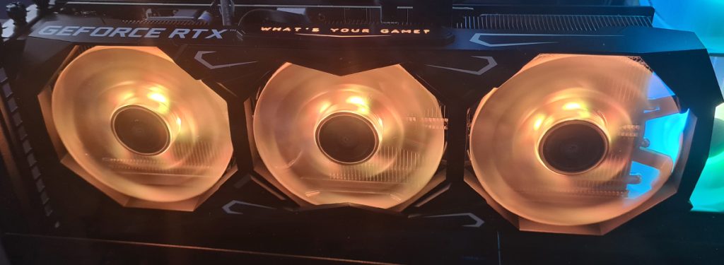Natürlich haben wir auch ein paar Bilder der beleuchteten KFA2 RTX 3060 Ti SG Plus für euch eingefangen. Die Ausleuchtung und die damit zusammenhängende Leuchtkraft der Lüfter ist aussagekräftig, nicht aufdringlich, aber wirkungsvoll.