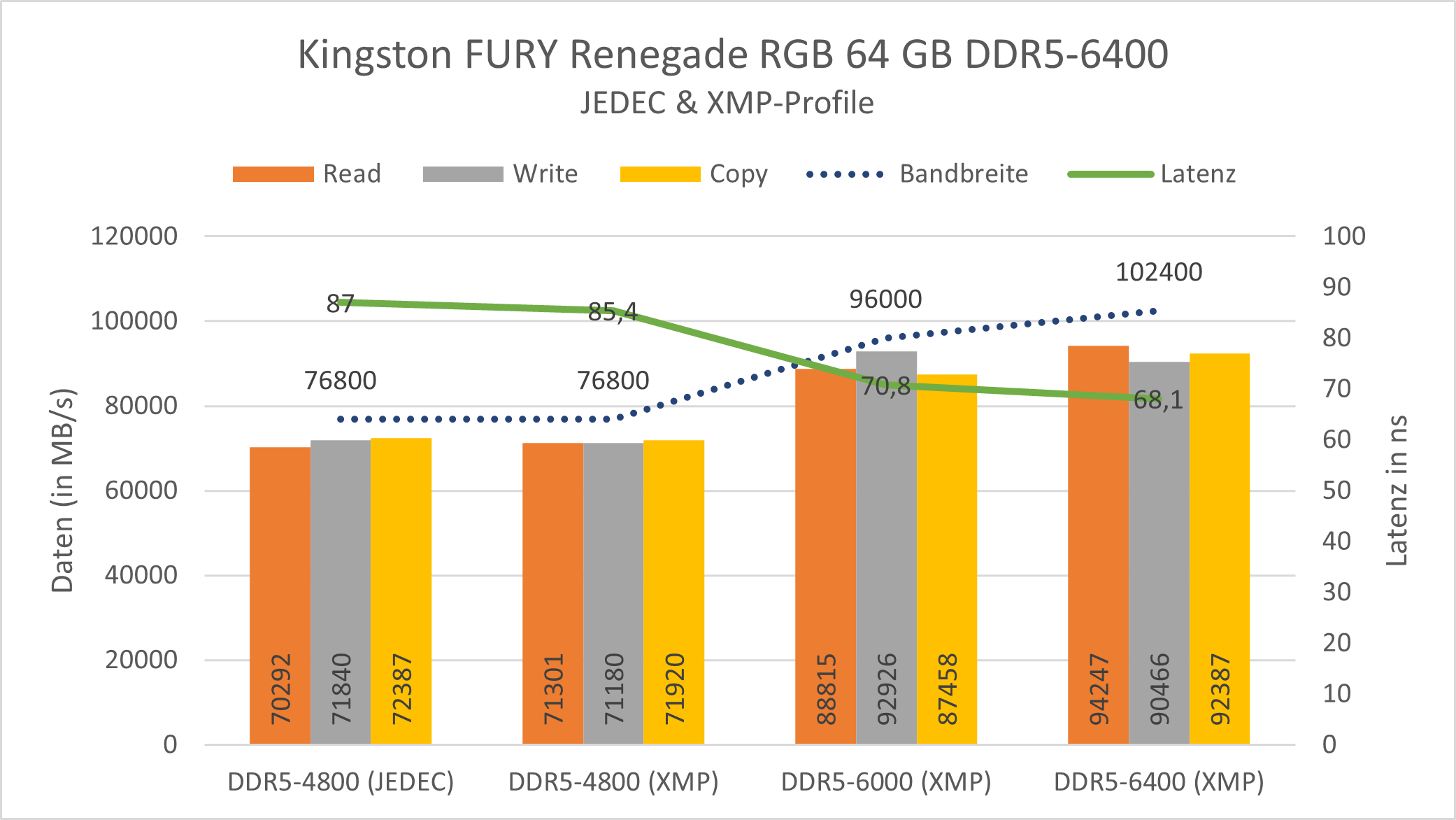 Auch wenn das DDR5-4800 Profil vom Takt her dem JEDEC Profil entspricht, sorgen die geringeren Subtimings für eine schnellere Latenz und eine etwas bessere Performance. Auf unserem Testsystem bleibt die Performance des AIDA-Benchmarks teilweise deutlich unter der theoretischen Bandbreite, was auch an der Auswahl der Komponenten liegen kann. Aus diesem Grund haben wir das JEDEC- und das primäre XMP-Profil auch auf einem 2. System getestet, auf das im folgenden Abschnitt noch näher eingegangen wird.