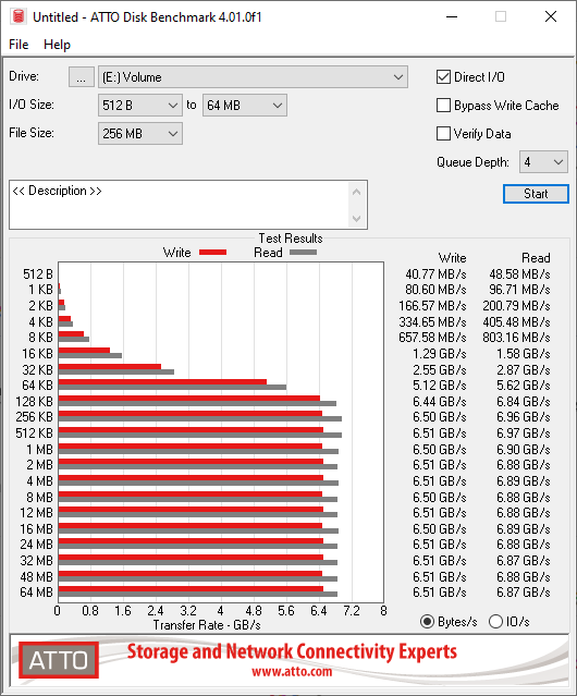 Bei dem Atto Disk Benchmark können anhand der unterschiedlichen I/O-Größen den Datentransfer präzise wiedergeben. Ab einer I/O-Größe von 128 KB erreichen wir unsere maximalen Datendurchsätze, wobei der Test Schreibgeschwindigkeiten von ca. 6,5 GB/s und Lesegeschwindigkeiten von ca. 6,9 GB/s liefert. Damit liegen die Ergebnisse unter denen vom CrystalDiskMark und unter den Herstellerangaben.