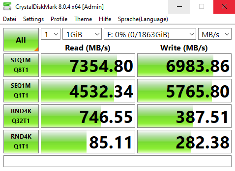 Wir beginnen unsere Leistungstests mit einem Durchlauf des CrystalDiskMark, um eine Übersicht über die Leistung zu erhalten. In unserem Test haben die sequentiellen Datendurchsätze in etwa den Herstellerangaben entsprochen. Bei der Lesegeschwindigkeit liegen wir mit 7354,8 MB/s etwa 54,8 MB/s über den Herstellerangaben. Bei der Schreibgeschwindigkeit, erreichen wir 6983,86 MB/s, statt der angegebenen 7.000 MB/s, damit sind wir knapp darunter. In dem randomisierten Test erreichen wir immerhin noch etwa 85,11 MB/s Lesegeschwindigkeit und 282,38 MB/s Schreibgeschwindigkeit.