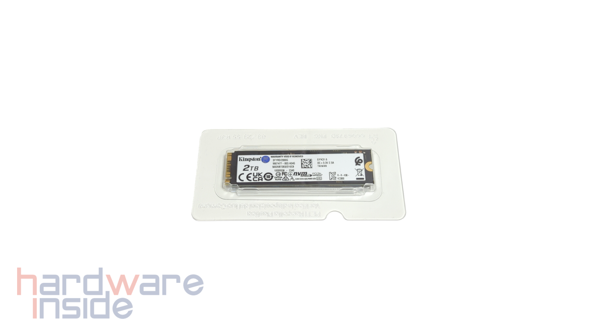 Die Kingston Fury Renegade wird in einer Blister-Verpackung geliefert. Im oberen Teil der Vorderseite sind das Herstellerlogo, die Produktbezeichnung sowie Angaben zur Speicherkapazität, Anbindung und Performance aufgedruckt. Im unteren Bereich ist die Kingston Fury Renegade durch ein Kunststoffsichtfenster zu sehen. Auf der Rückseite sind lediglich Hinweise in mehreren Sprachen aufgeführt.