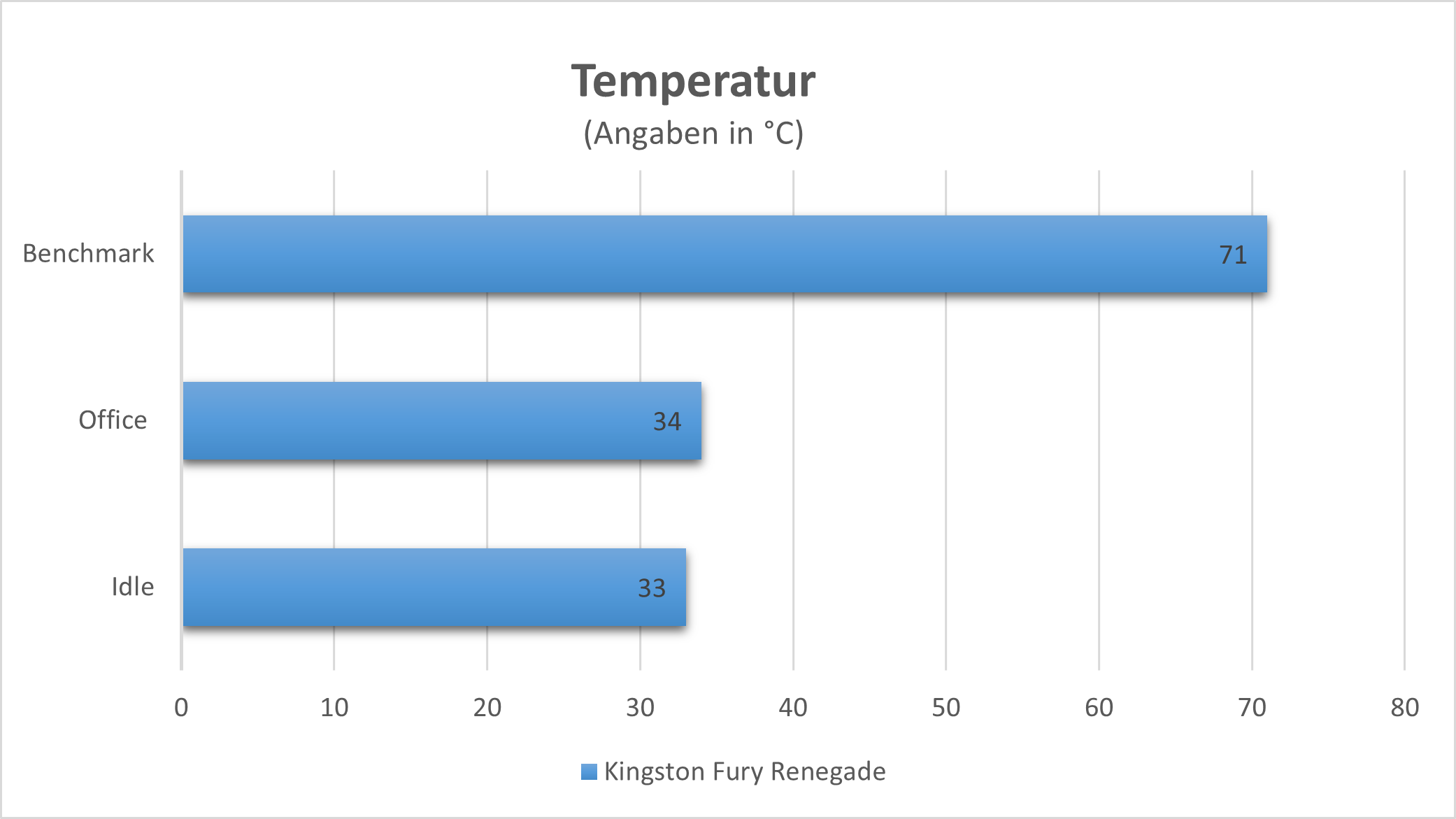 Wir überprüfen die Temperatur der Kingston Fury Renegade, indem wir sie in drei Szenarien jeweils 30 Minuten betreiben und anschließend die Temperatur mit dem Tool HWInfo auslesen. Die Raumtemperatur liegt bei 22 °C. Der dazugehörige Heatspreader leistet solide Arbeit, aber kann natürlich nicht mit einem Kühlkörper mithalten. So kommt die SSD unter Belastung ihrer vollen Leistung auf 71 °C, aber eine Drosselung der Geschwindigkeit findet nicht statt.