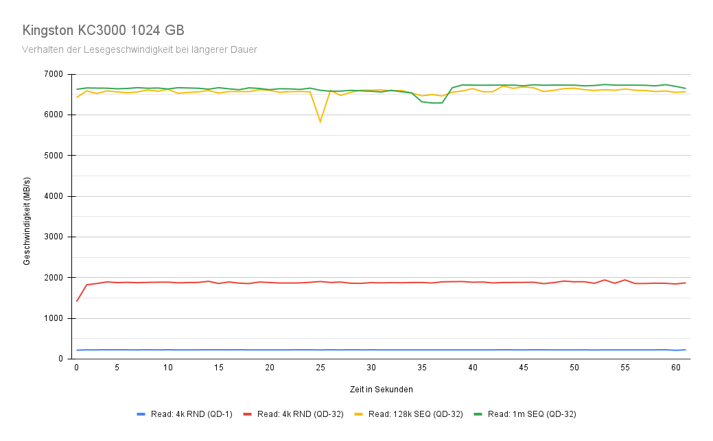 Betrachten wir zunächst die Lesegeschwindigkeit der Kingston KC3000 PCIe 4.0 NVMe SSD. Die blaue Linie ganz unten im Diagramm stellt die Messung des Szenarios für zufällige Zugriffe mit einer IO-Größe von 4k und einer Warteschlangentiefe von 1 dar. In diesem ungünstigsten Szenario erreichen wir eine durchschnittliche Geschwindigkeit von 224,4 MB/s. Um den Einfluss der Warteschlangentiefe zu ermitteln, erhöhen wir diese auf 32 und führen die Messung erneut durch. In diesem Szenario erreichen wir eine deutlich höhere Geschwindigkeit und lesen mit durchschnittlich 1.879,9 MB/s. Beide Werte sind erstaunlich hoch im Vergleich zu Szenarien, die mit Tools wie CrystalDiskMark erstellt wurden. Allerdings halten wir diese Ergebnisse nicht für vergleichbar. IOMeter arbeitet beispielsweise ohne Dateisystem und kann durch diese direkten Zugriffe bessere Geschwindigkeiten erreichen.